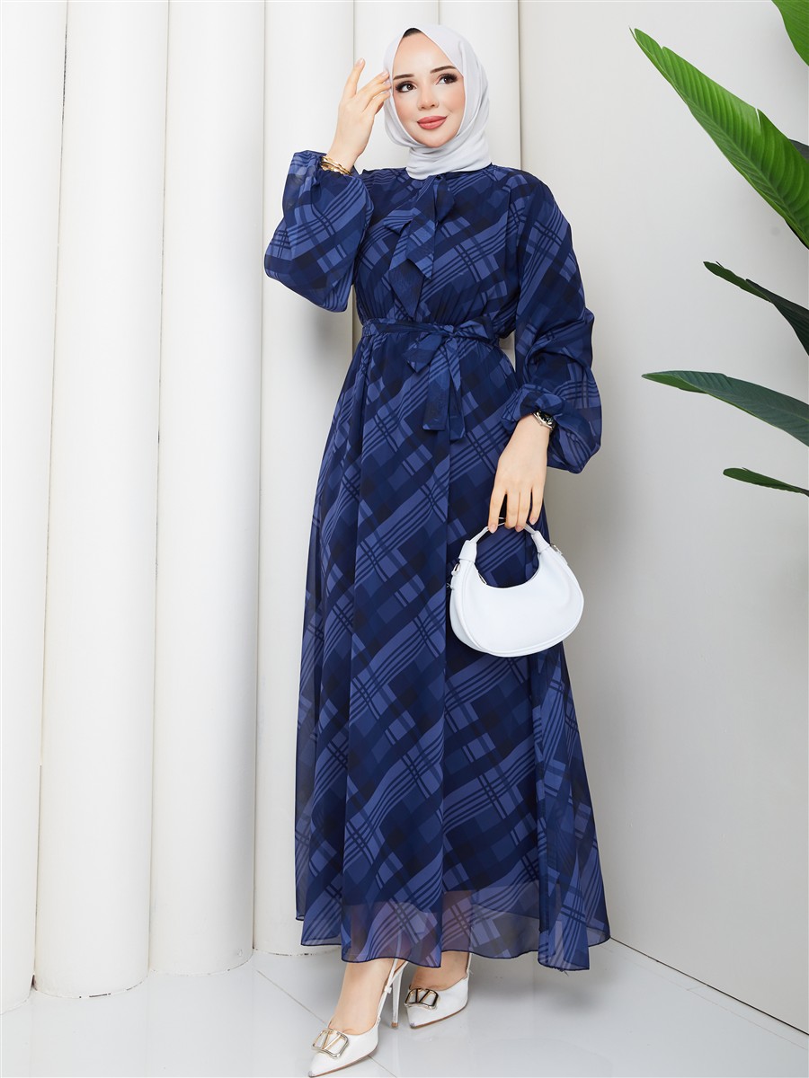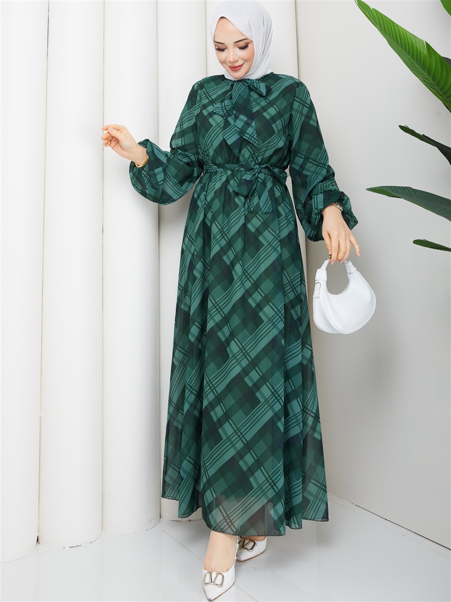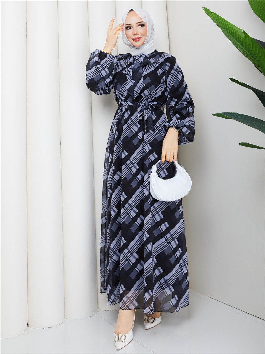 Boyundan Bağlamalı Ekose Tesettür Şifon Elbise RC6049