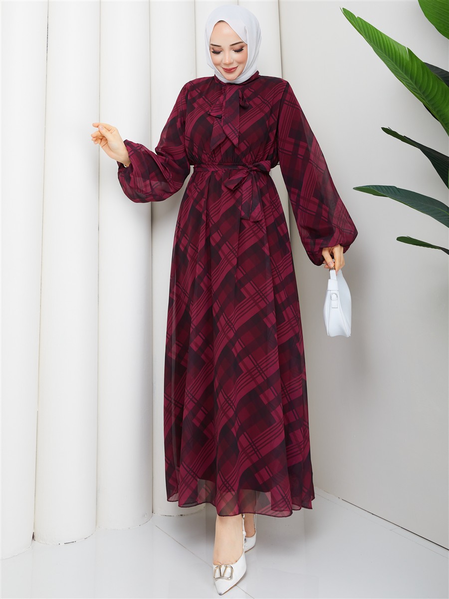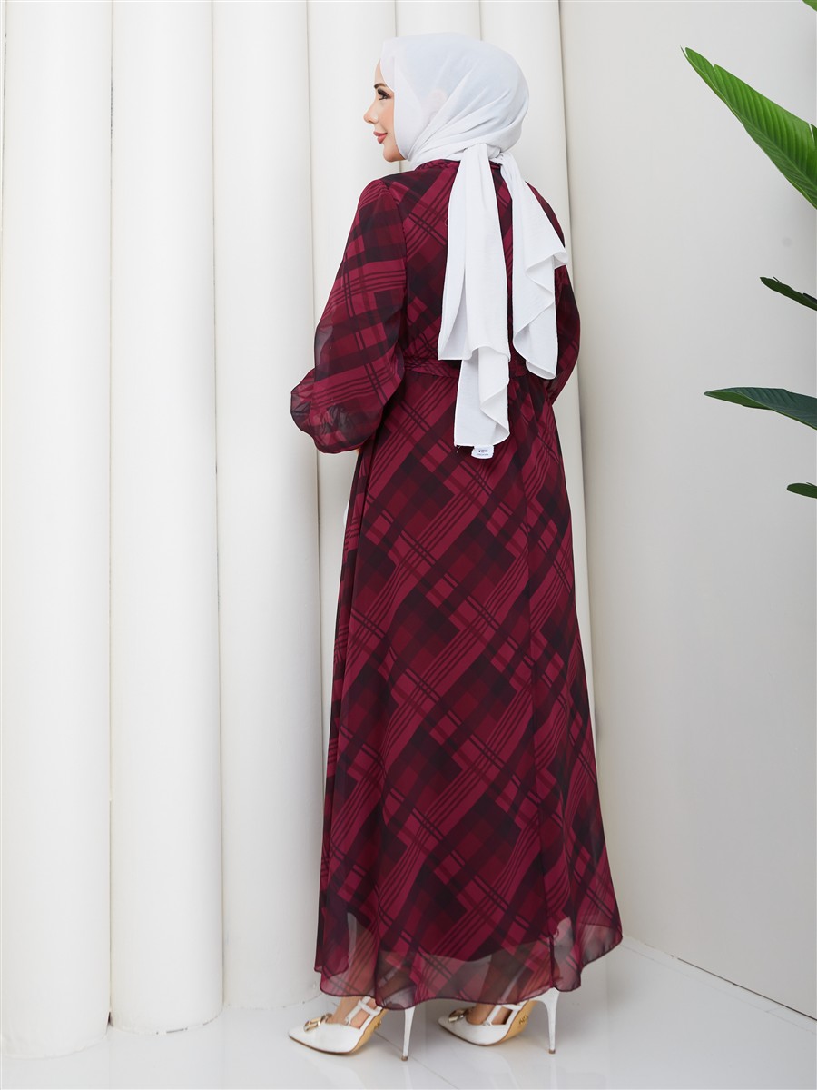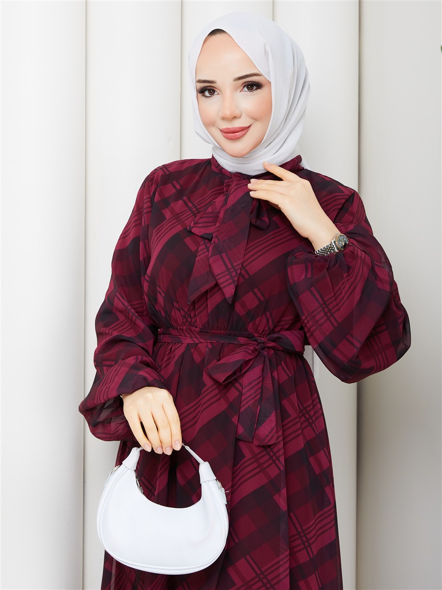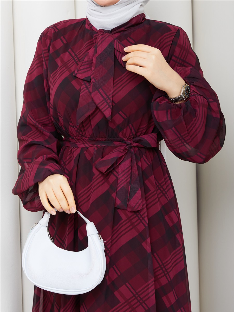 Boyundan Bağlamalı Ekose Tesettür Şifon Elbise RC6049