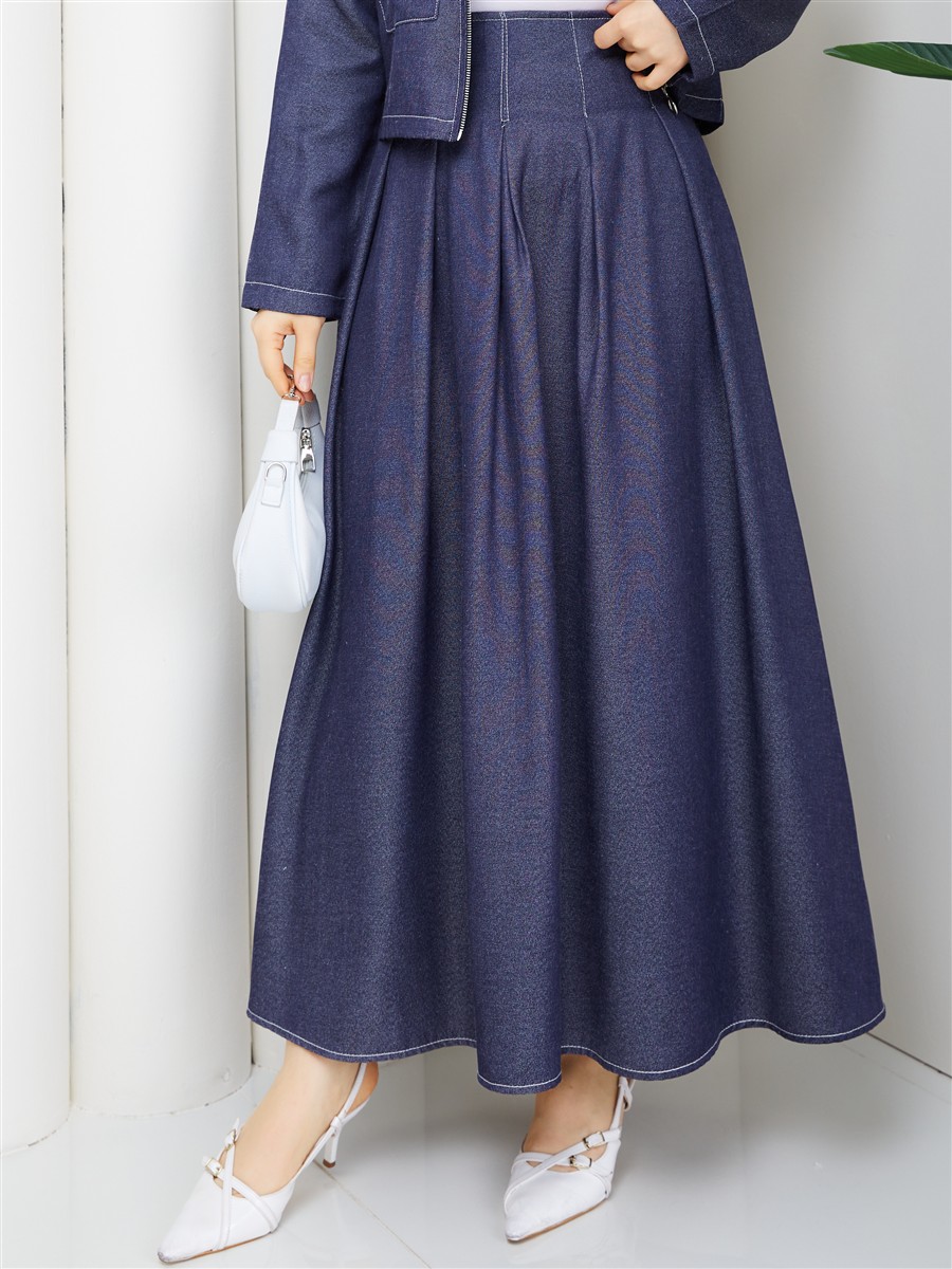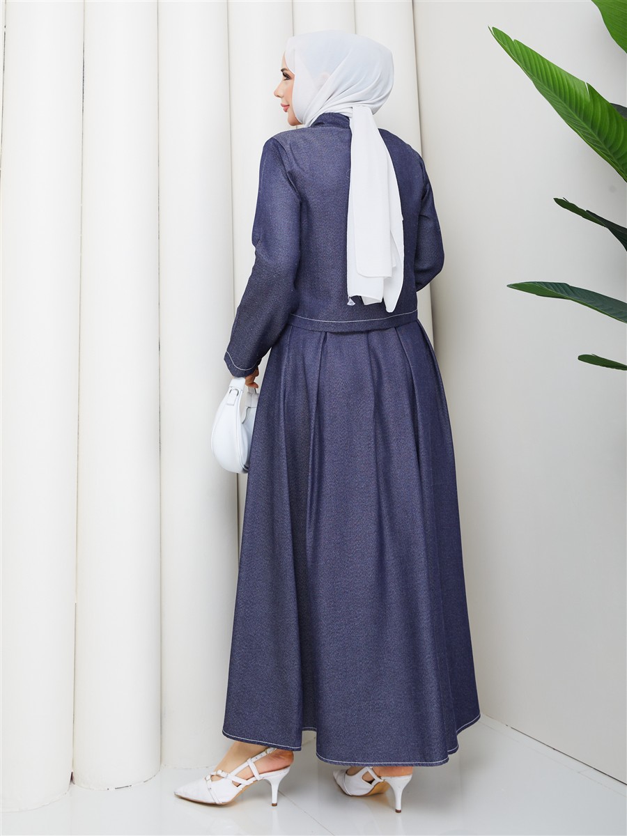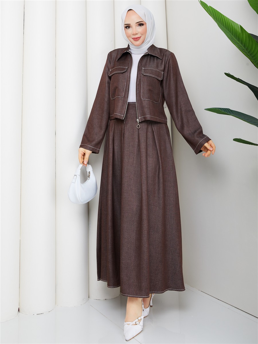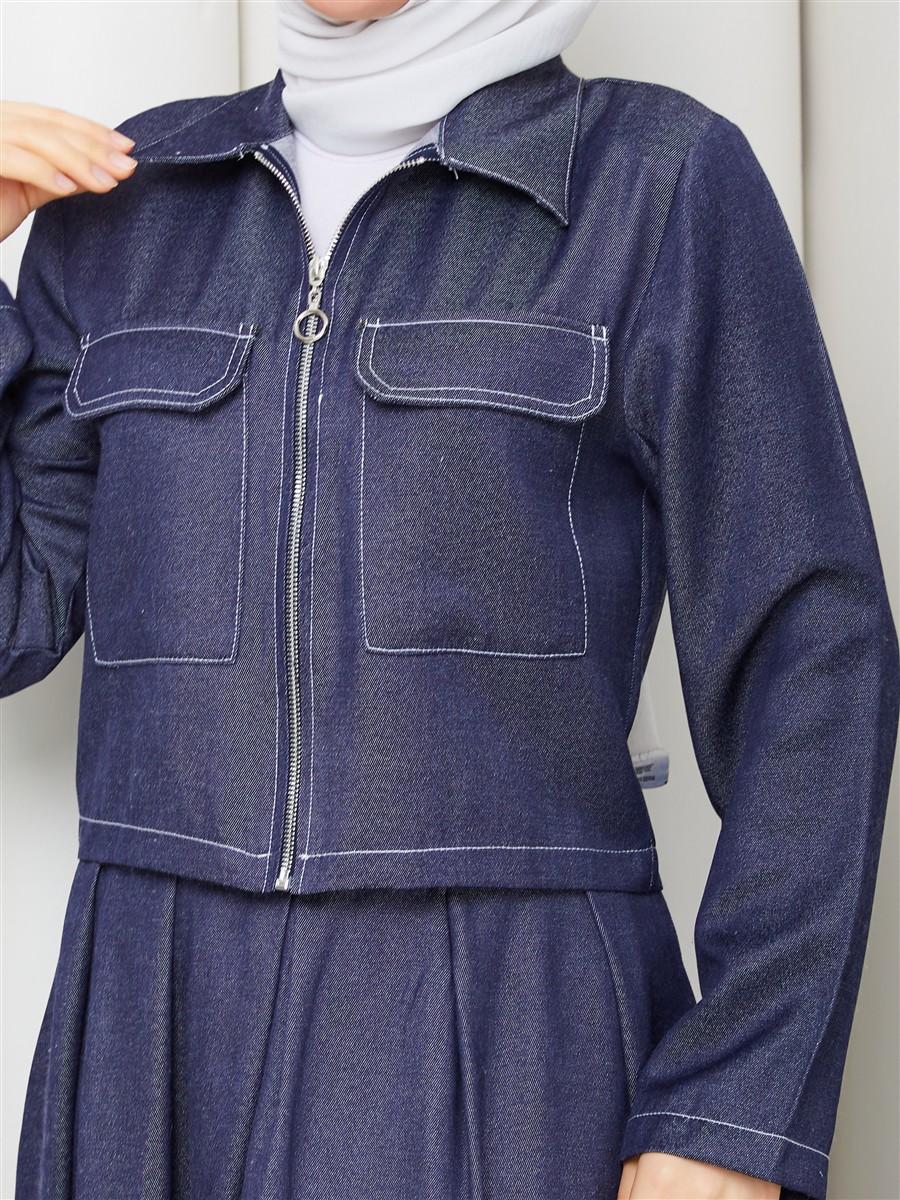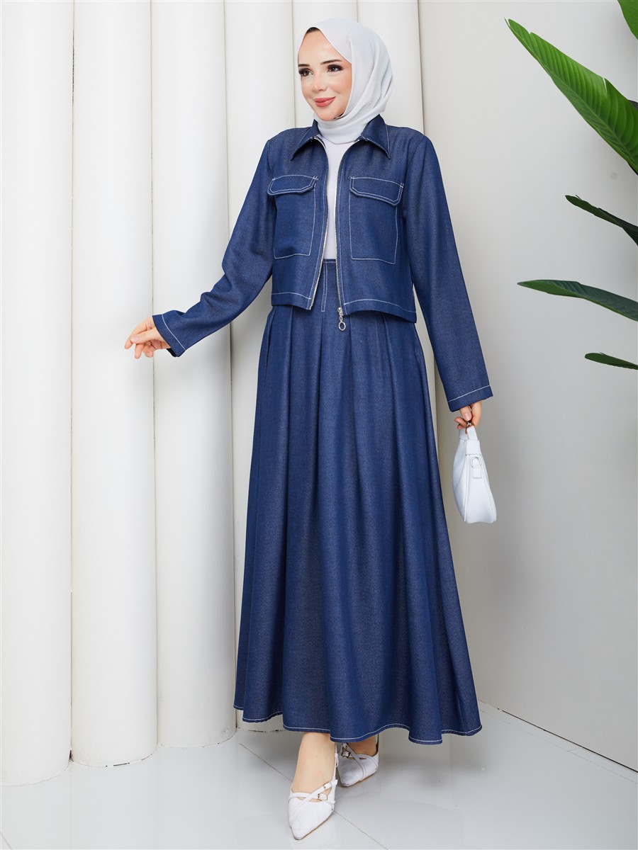 Cep Detaylı Fermuarlı Denim Ceket & Korsajlı Etek Tesettür Takım RC9033
