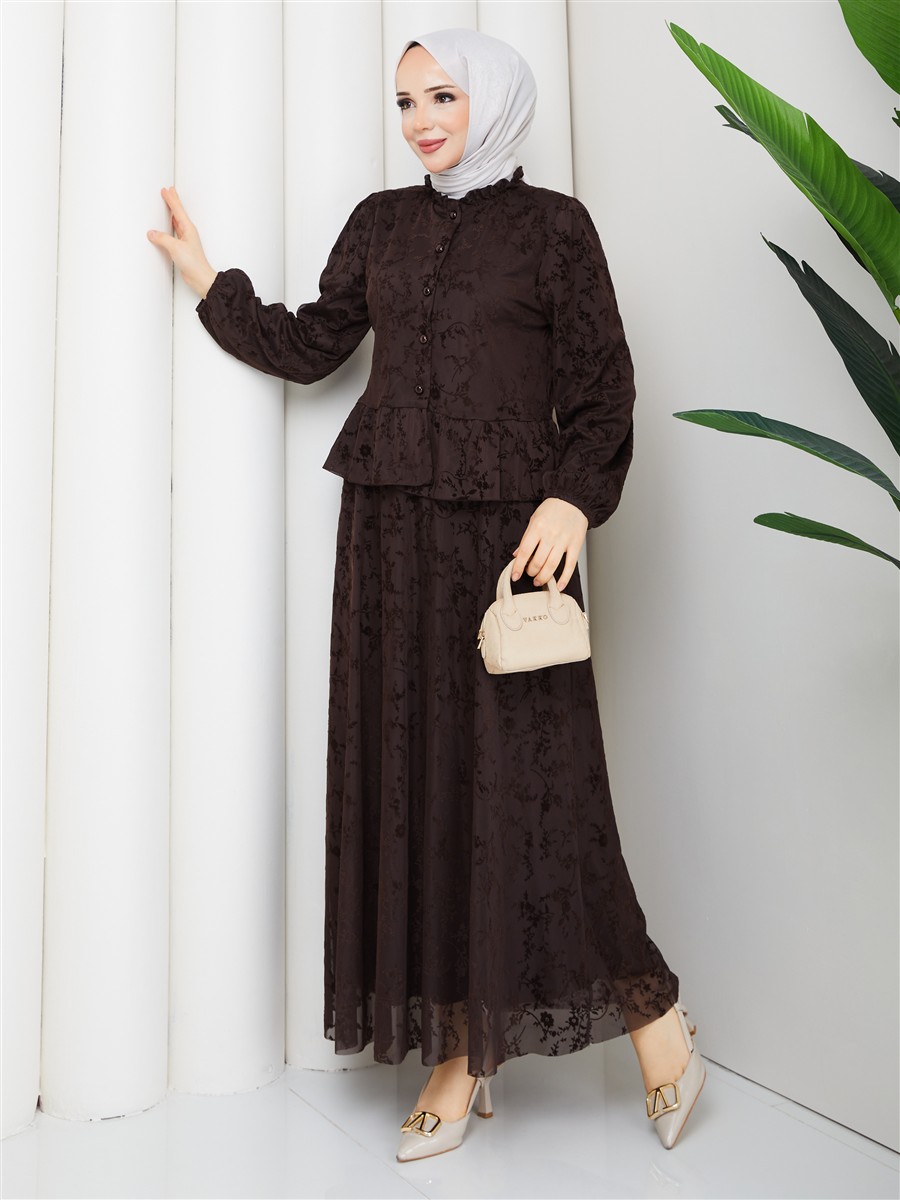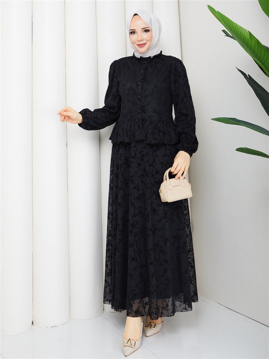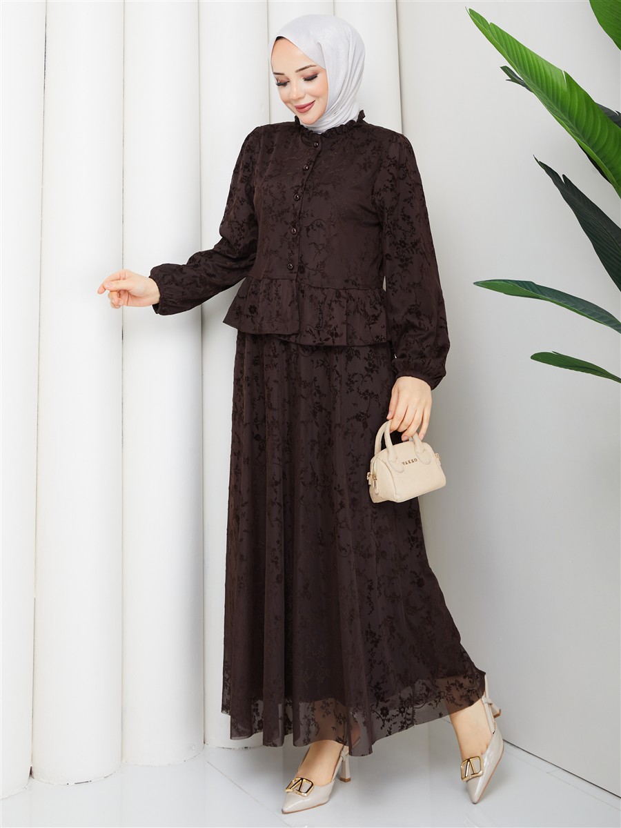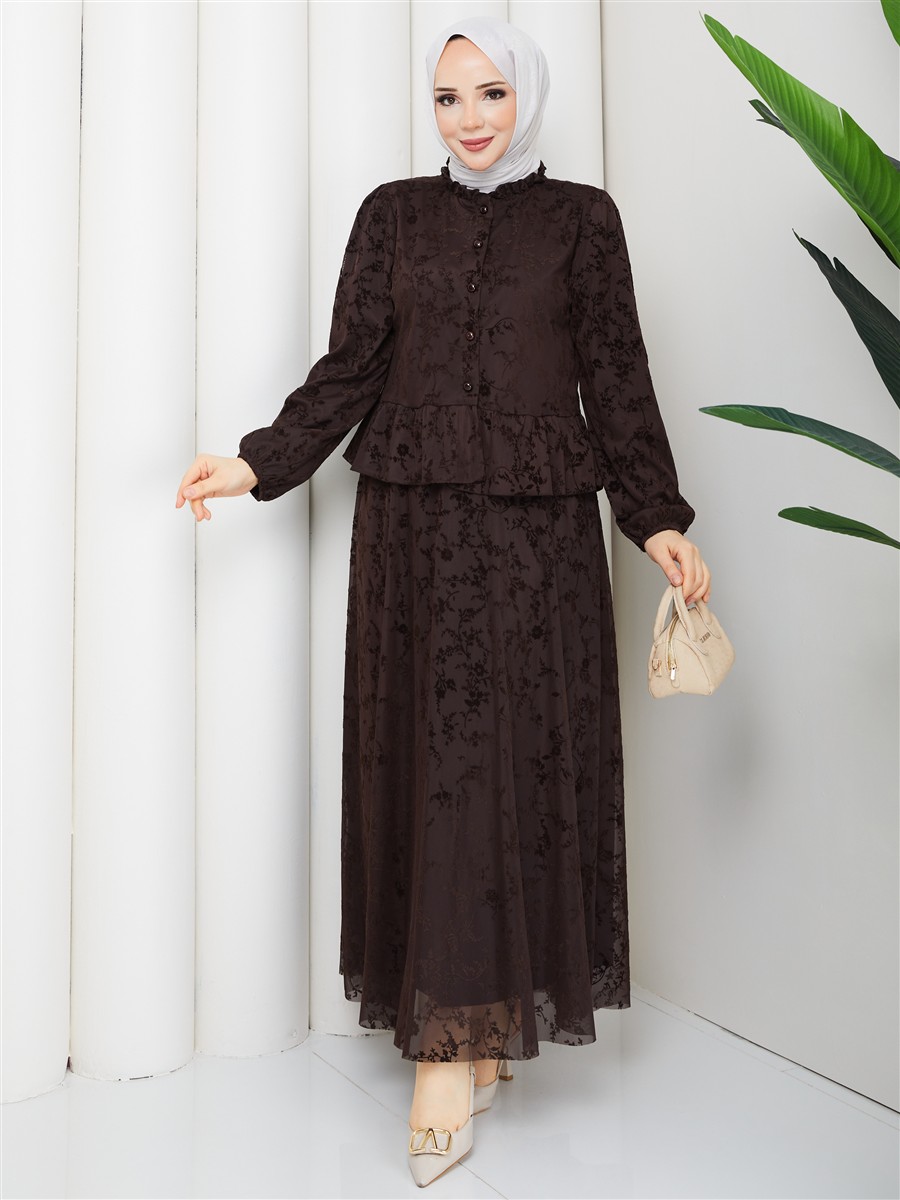 Dantel Kumaş Fırfır Detaylı Gömlek & Etek Tesettür Takım RC9035