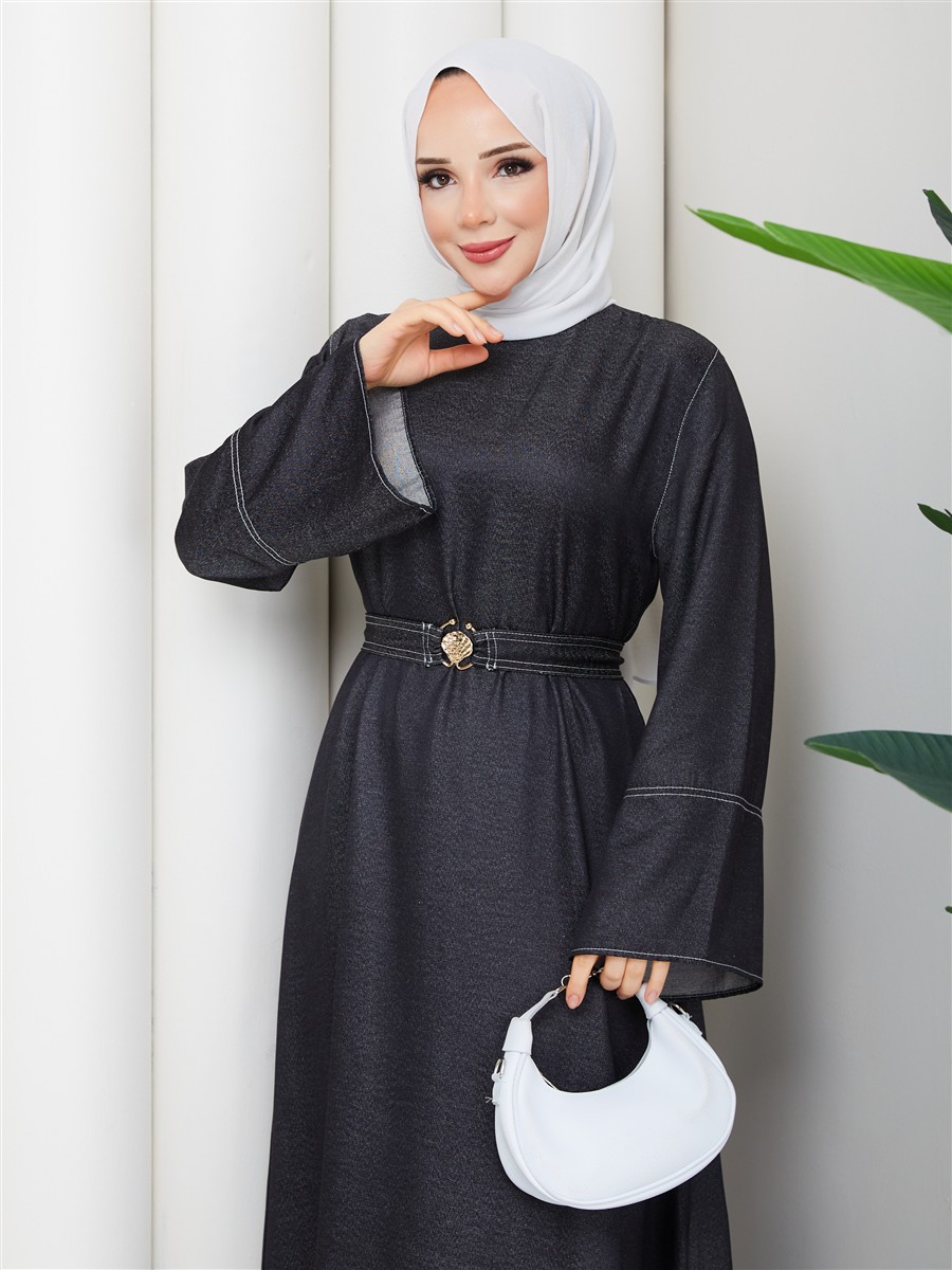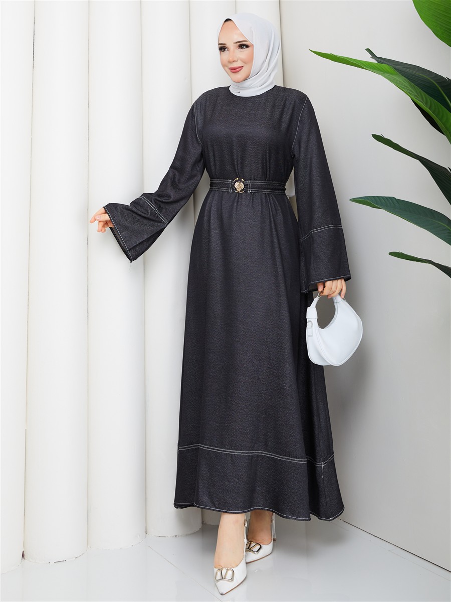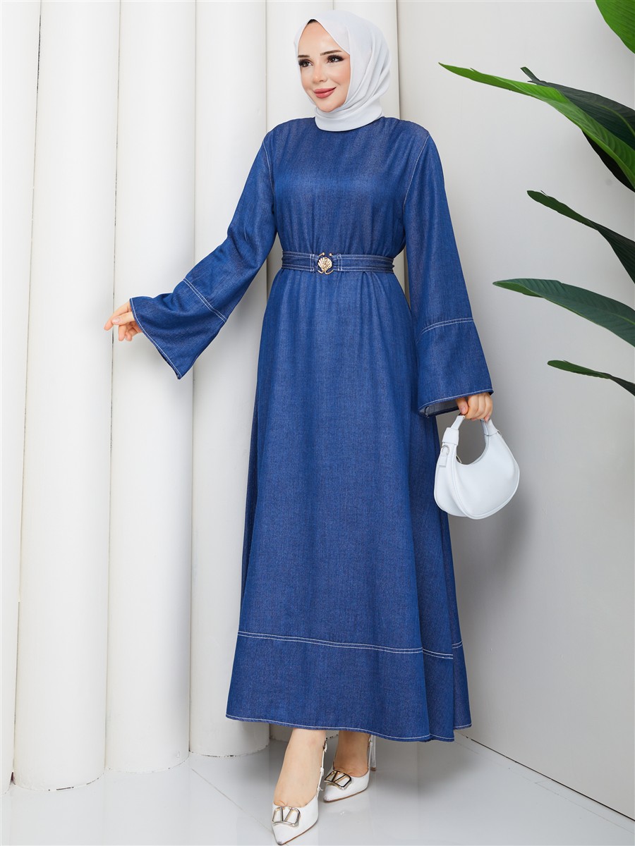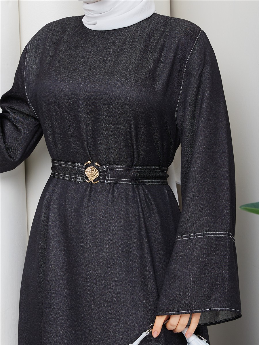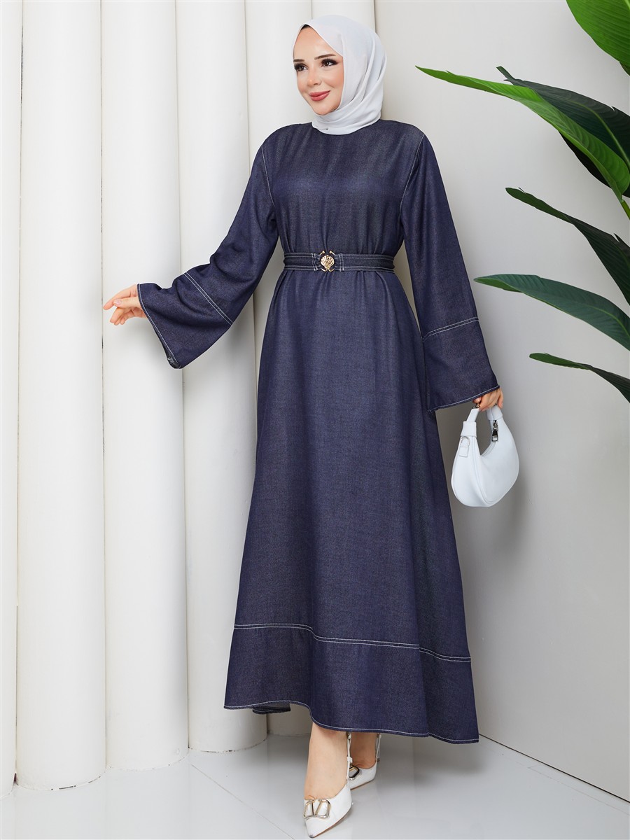 Kemer Detaylı Denim Kot Tesettür Elbise RC6036