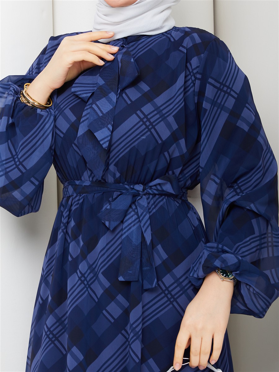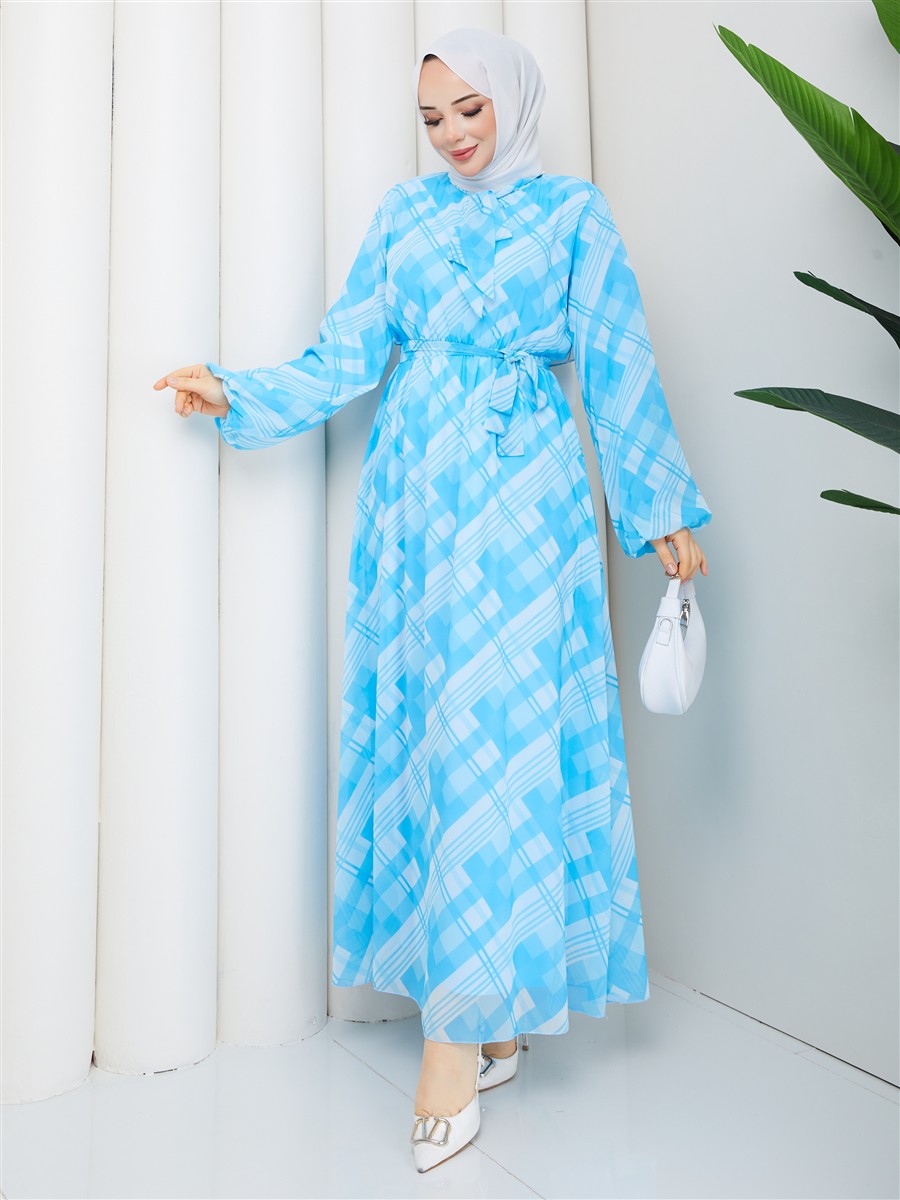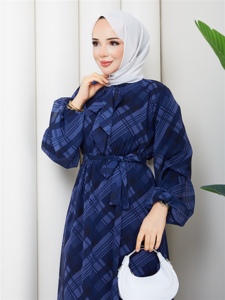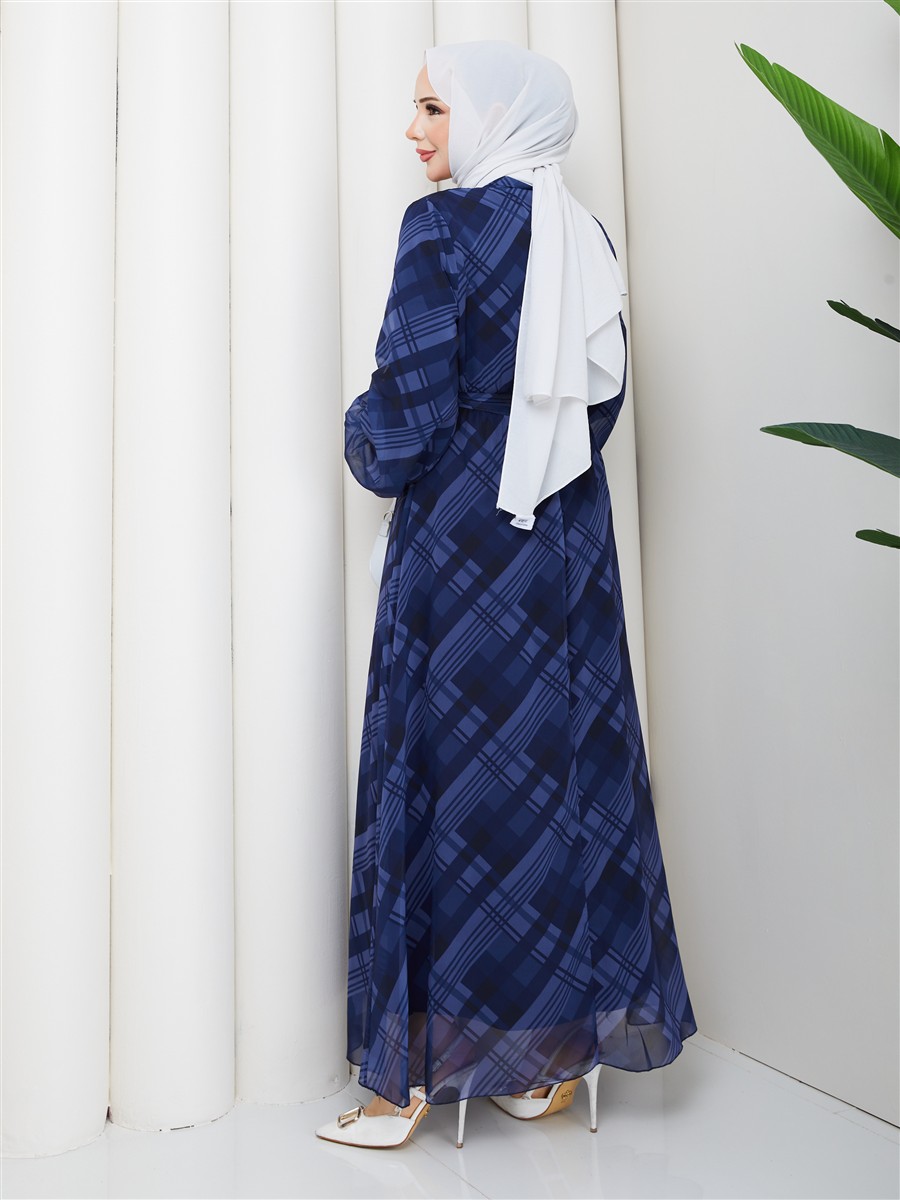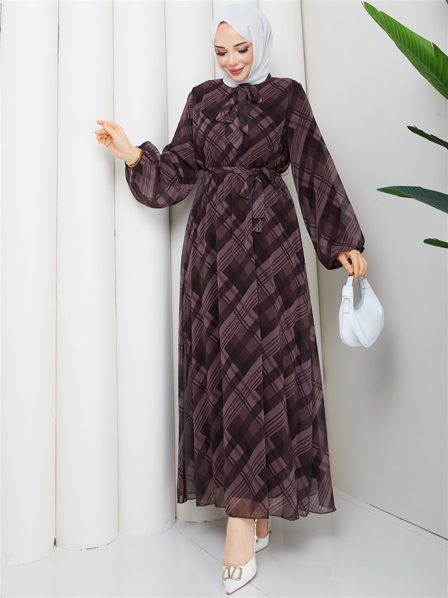 Boyundan Bağlamalı Ekose Tesettür Şifon Elbise RC6049