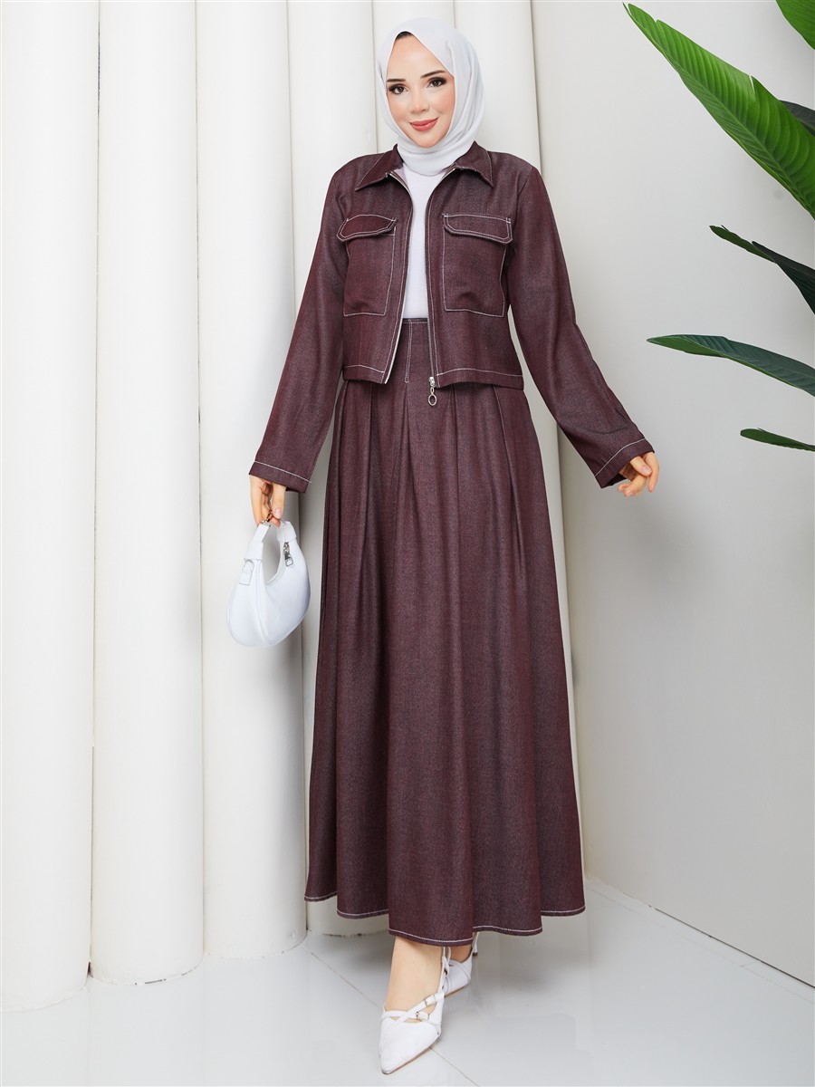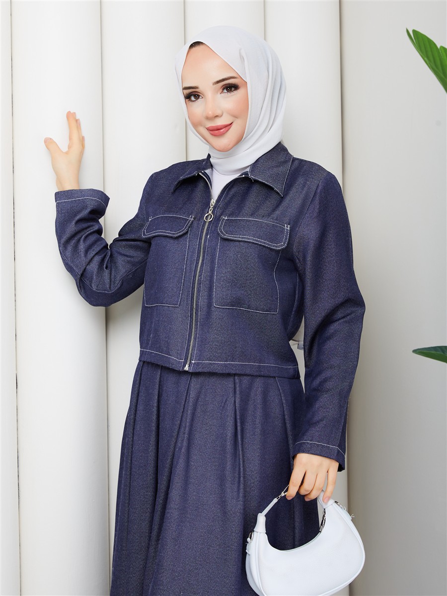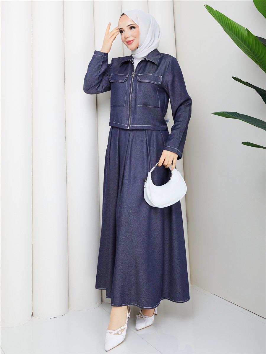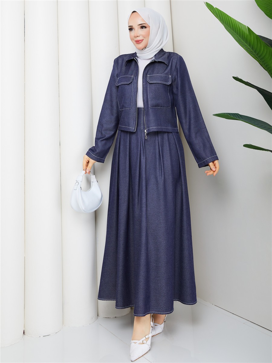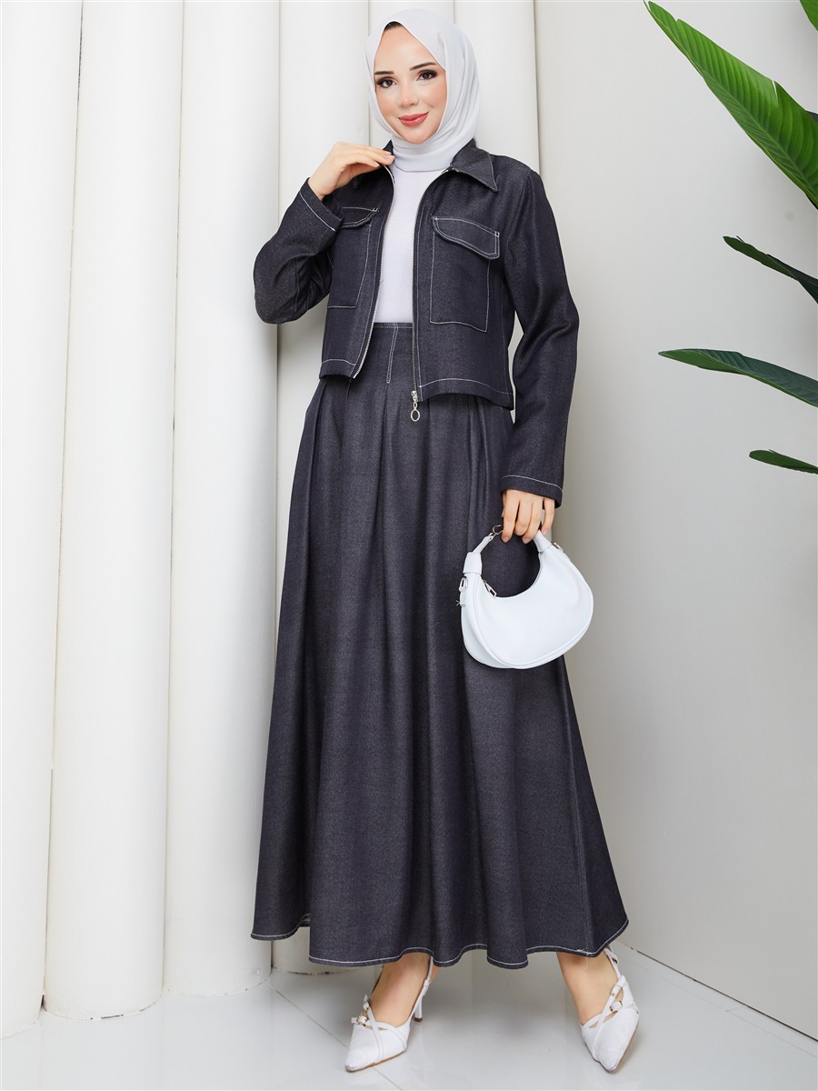 Cep Detaylı Fermuarlı Denim Ceket & Korsajlı Etek Tesettür Takım RC9033