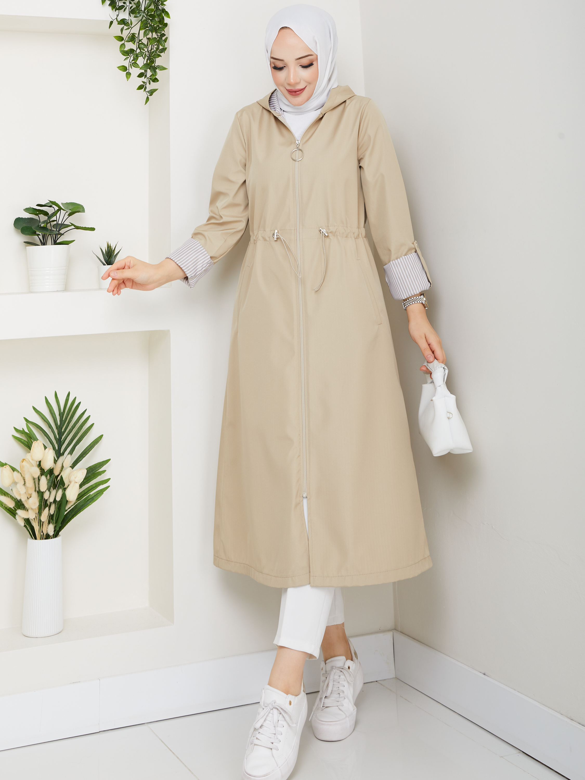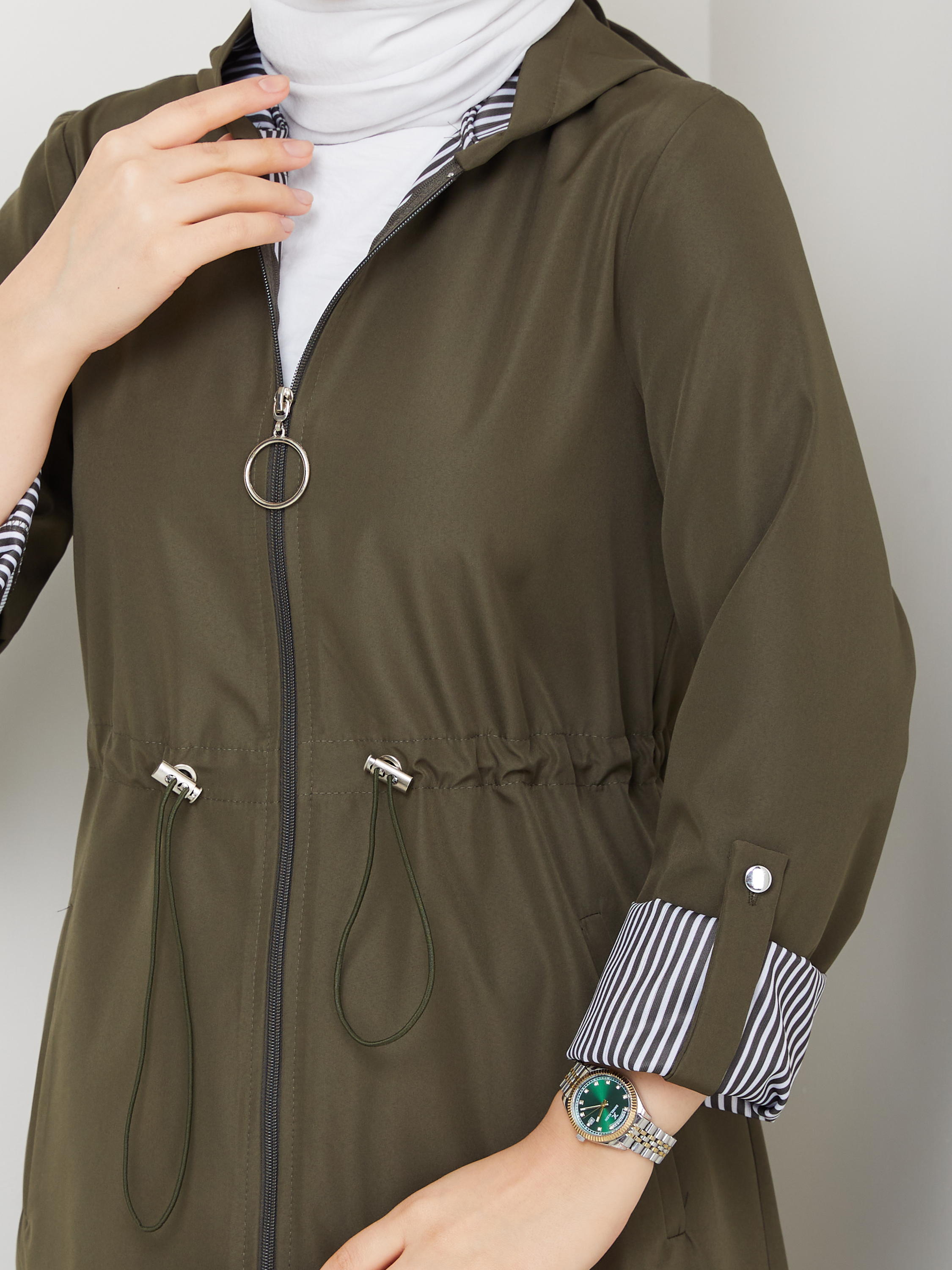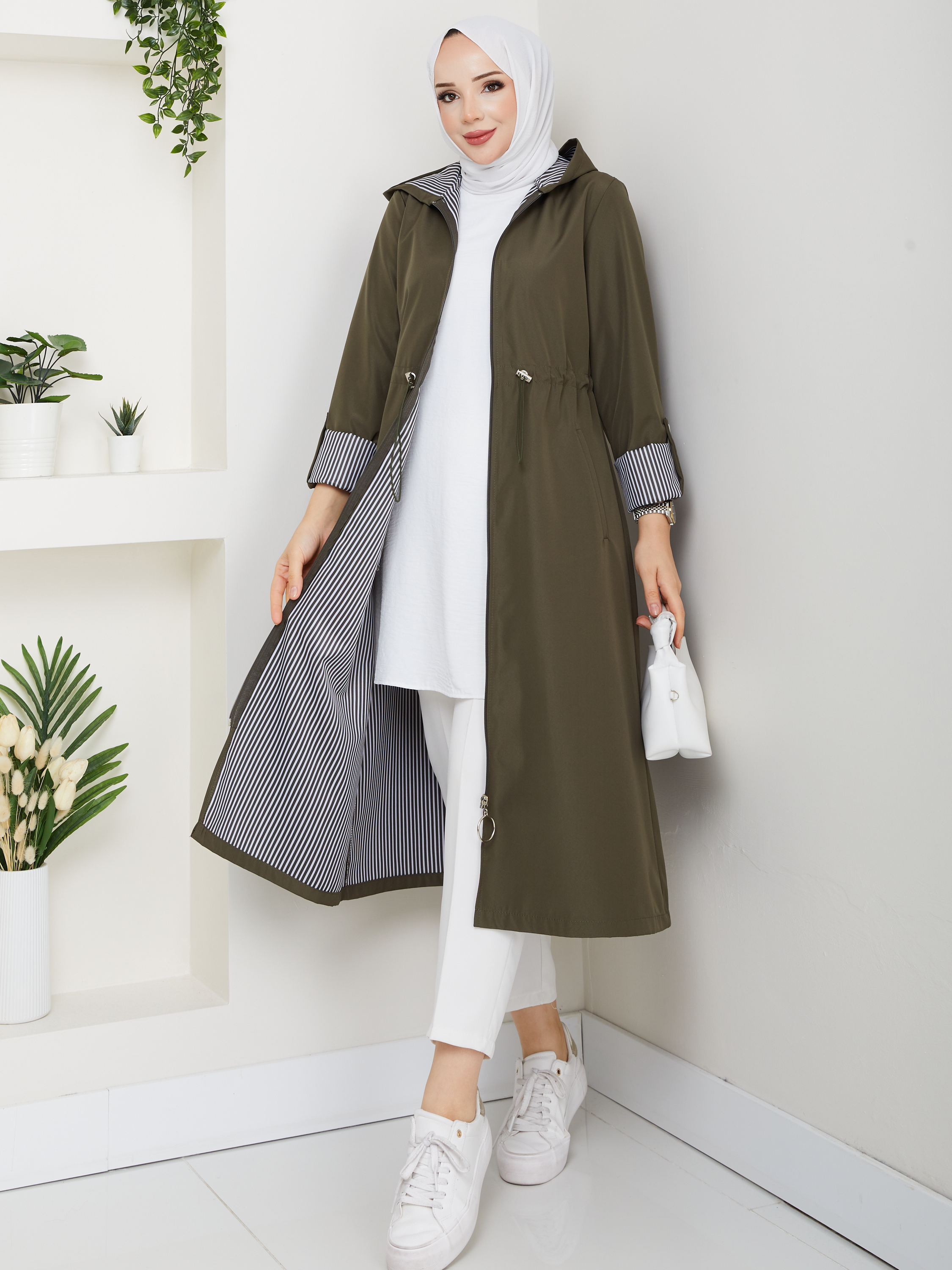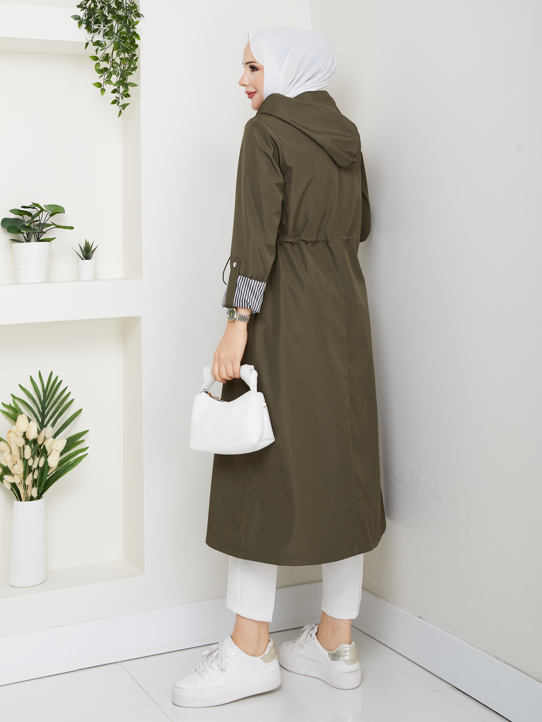 Çizgili Bondit Kumaş Beli Lastikli Kapşonlu Su Geçirmez Trençkot RC1205010
