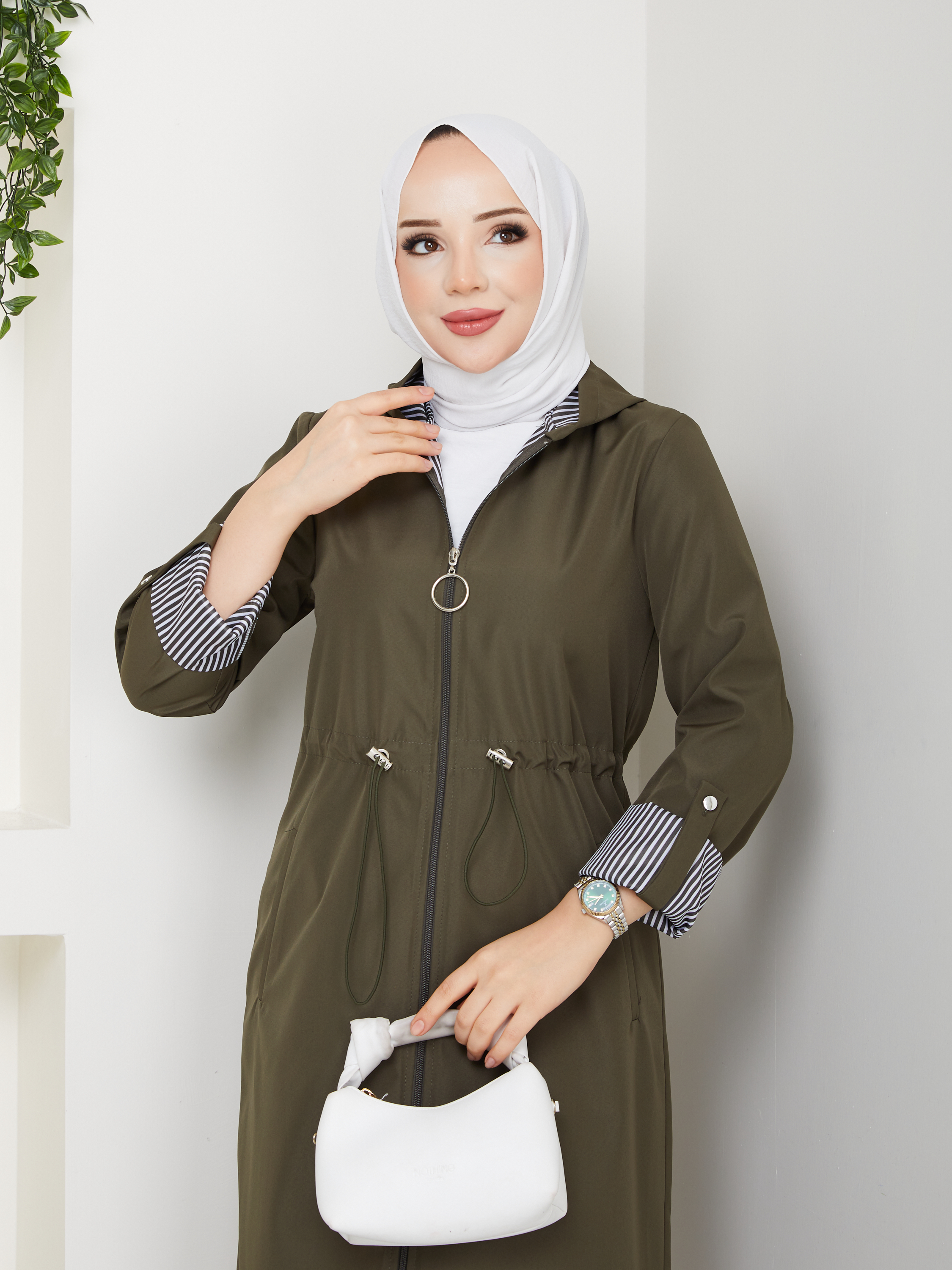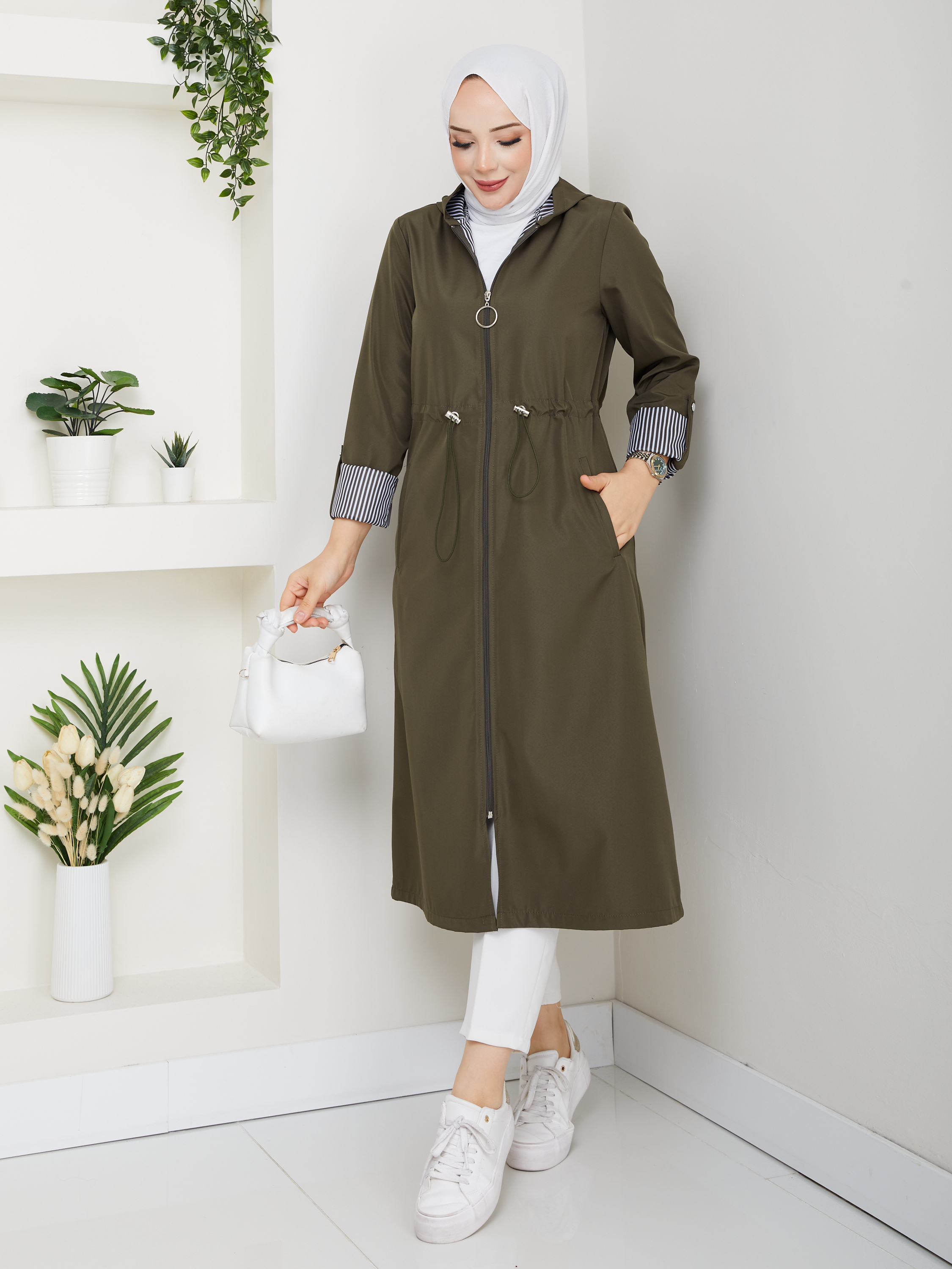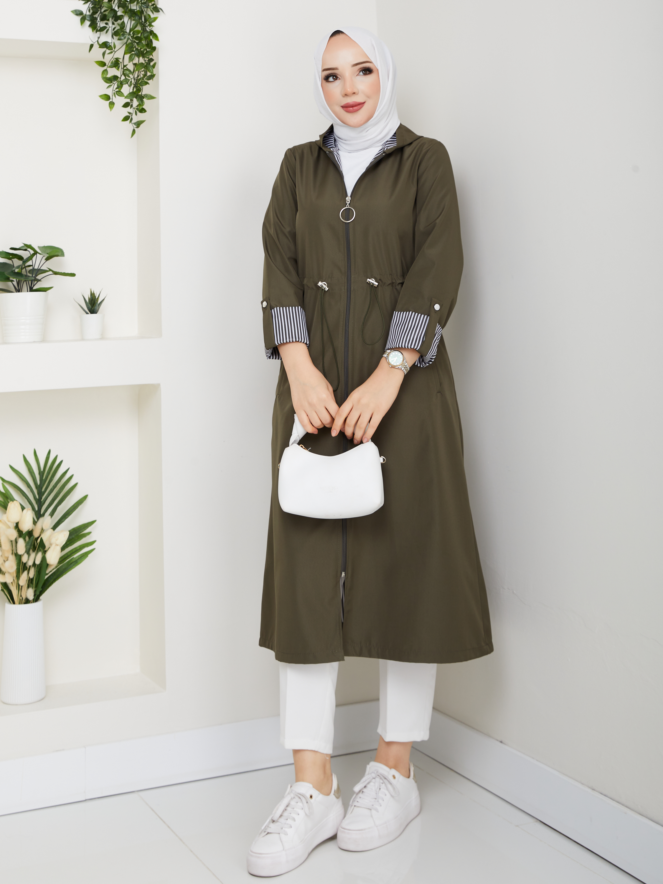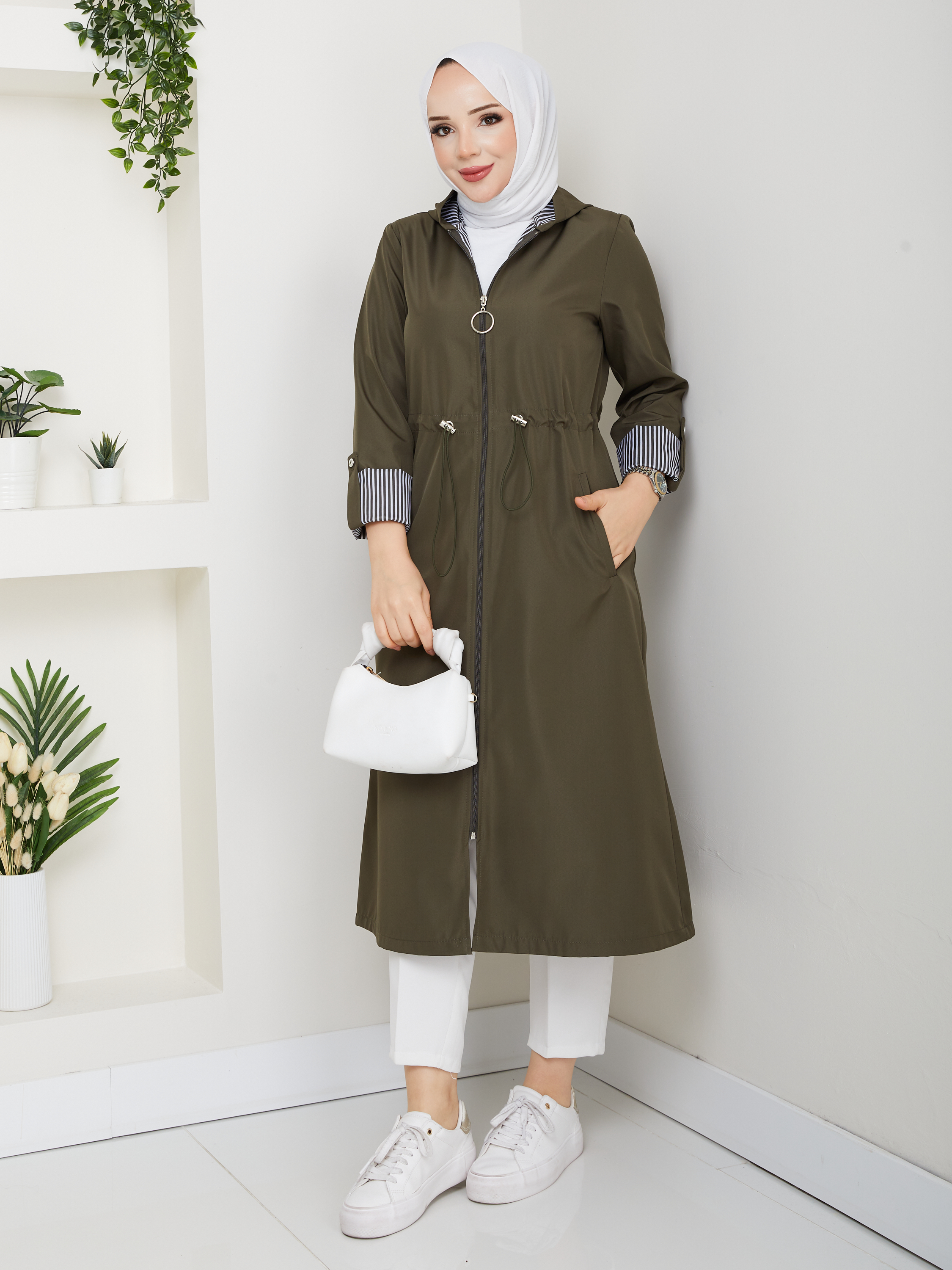 Çizgili Bondit Kumaş Beli Lastikli Kapşonlu Su Geçirmez Trençkot RC1205010
