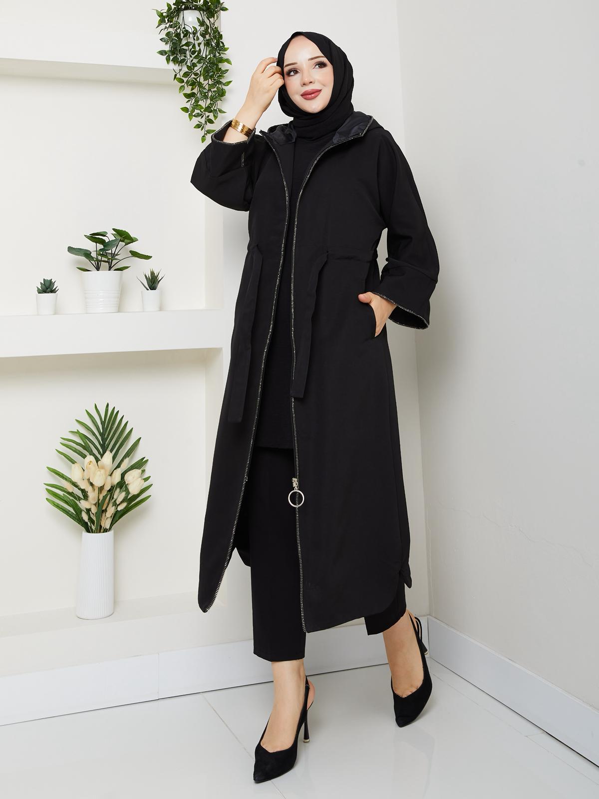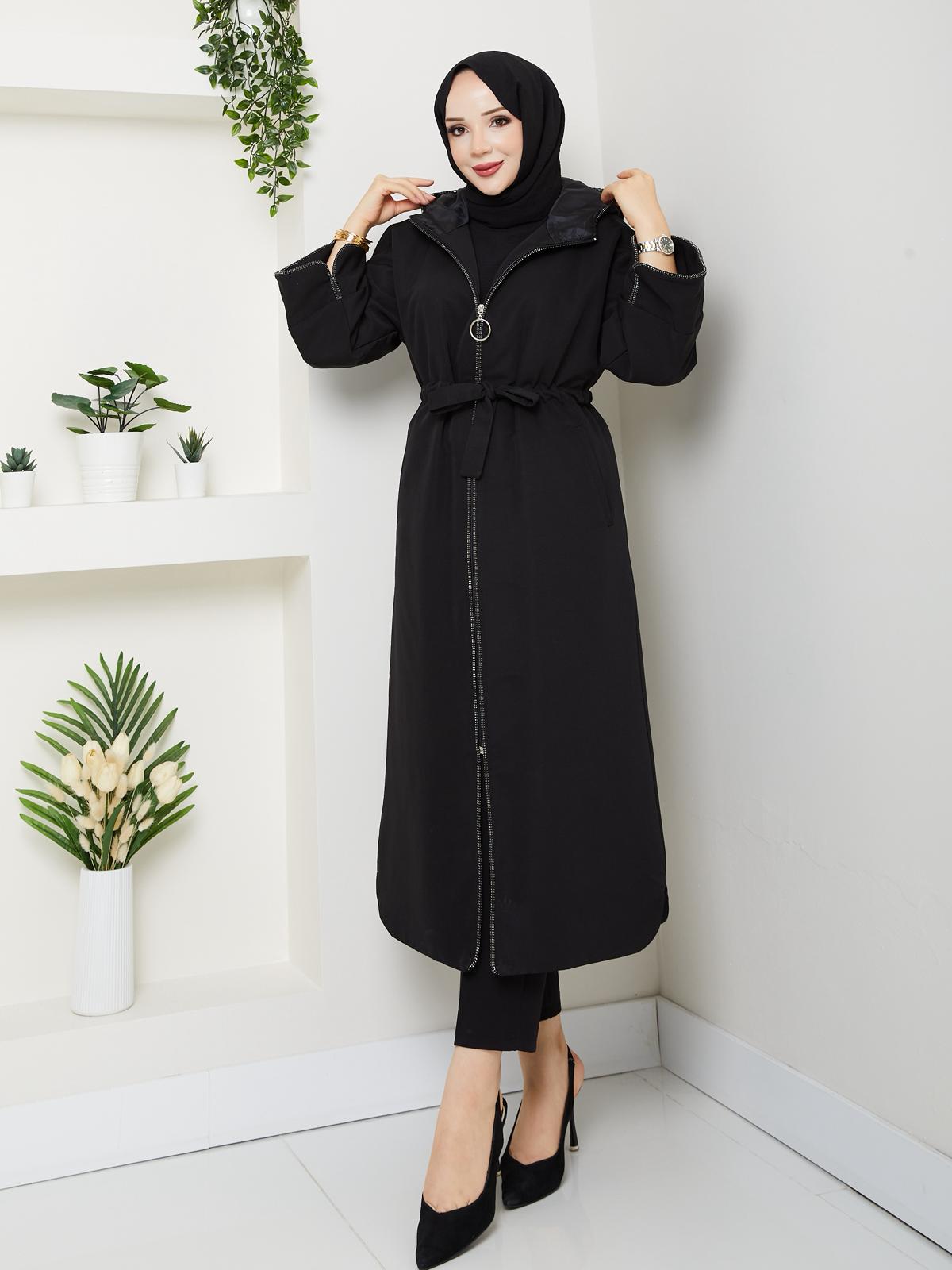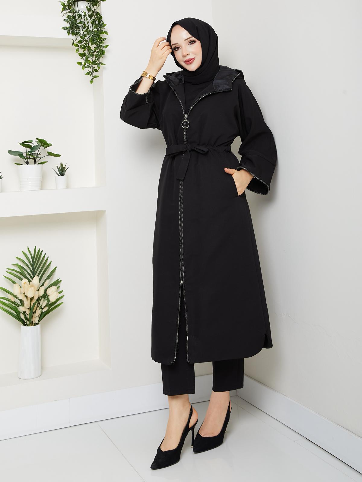 Fermuarlı Kapüşonlu Kemerli Astarlı Tesettürlü Kap RC1203048