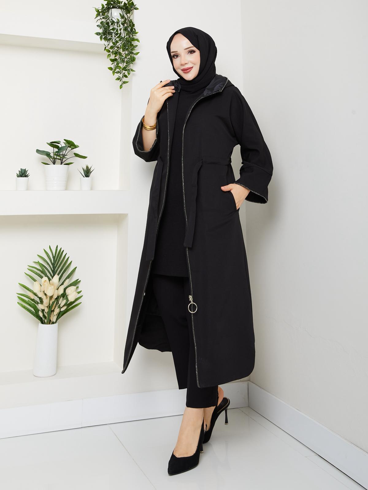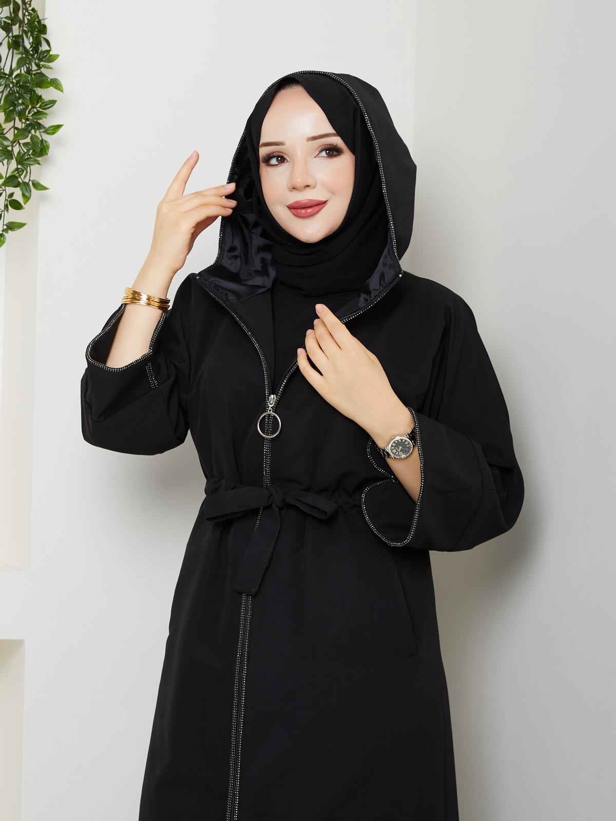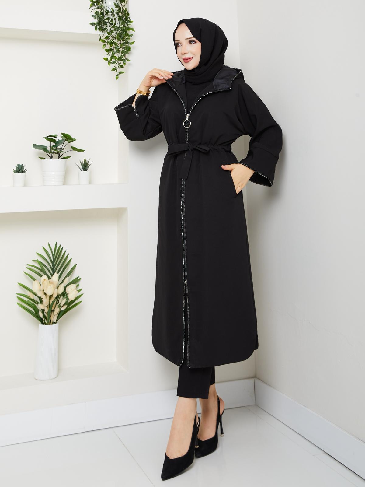 Fermuarlı Kapüşonlu Kemerli Astarlı Tesettürlü Kap RC1203048