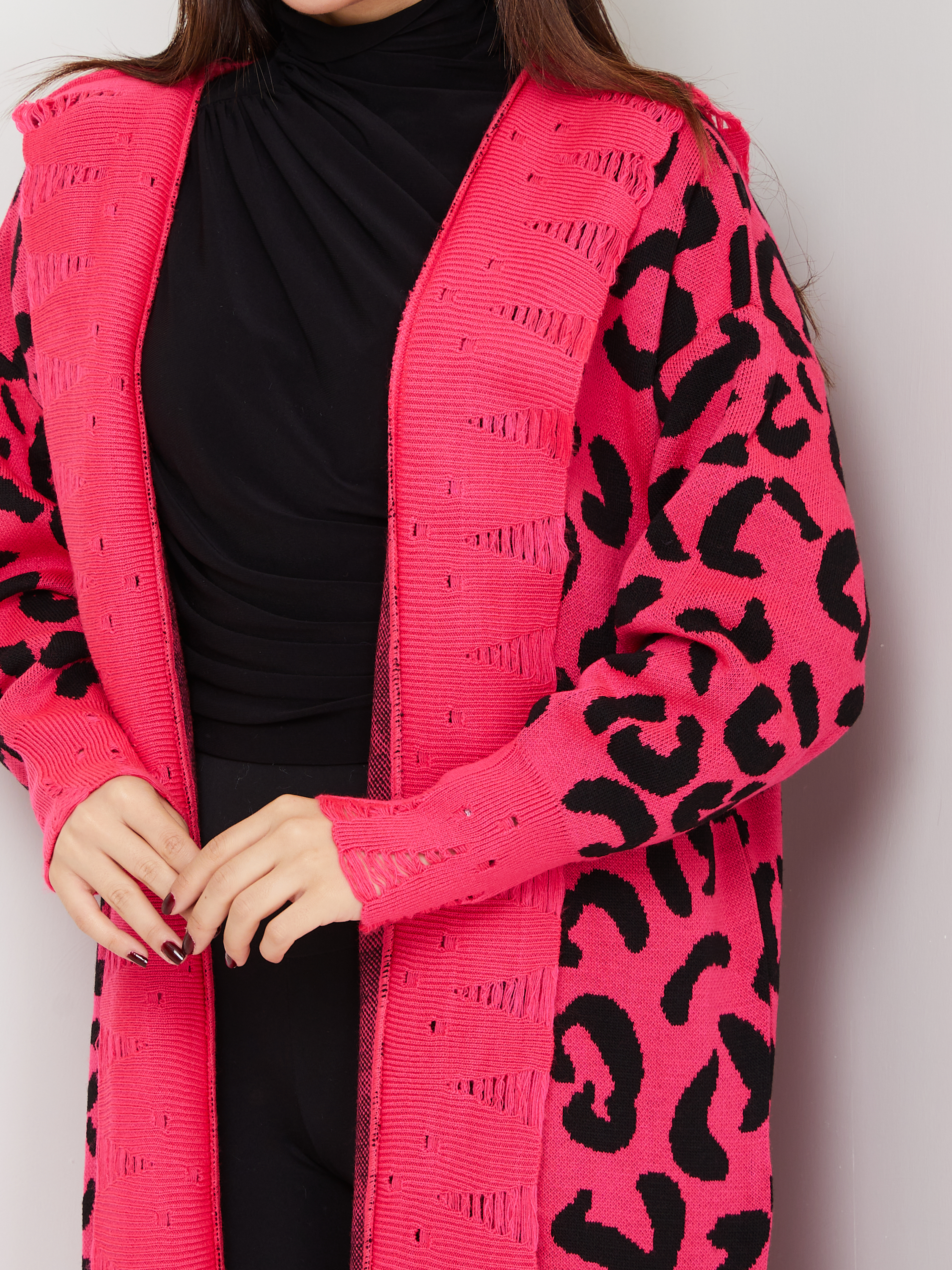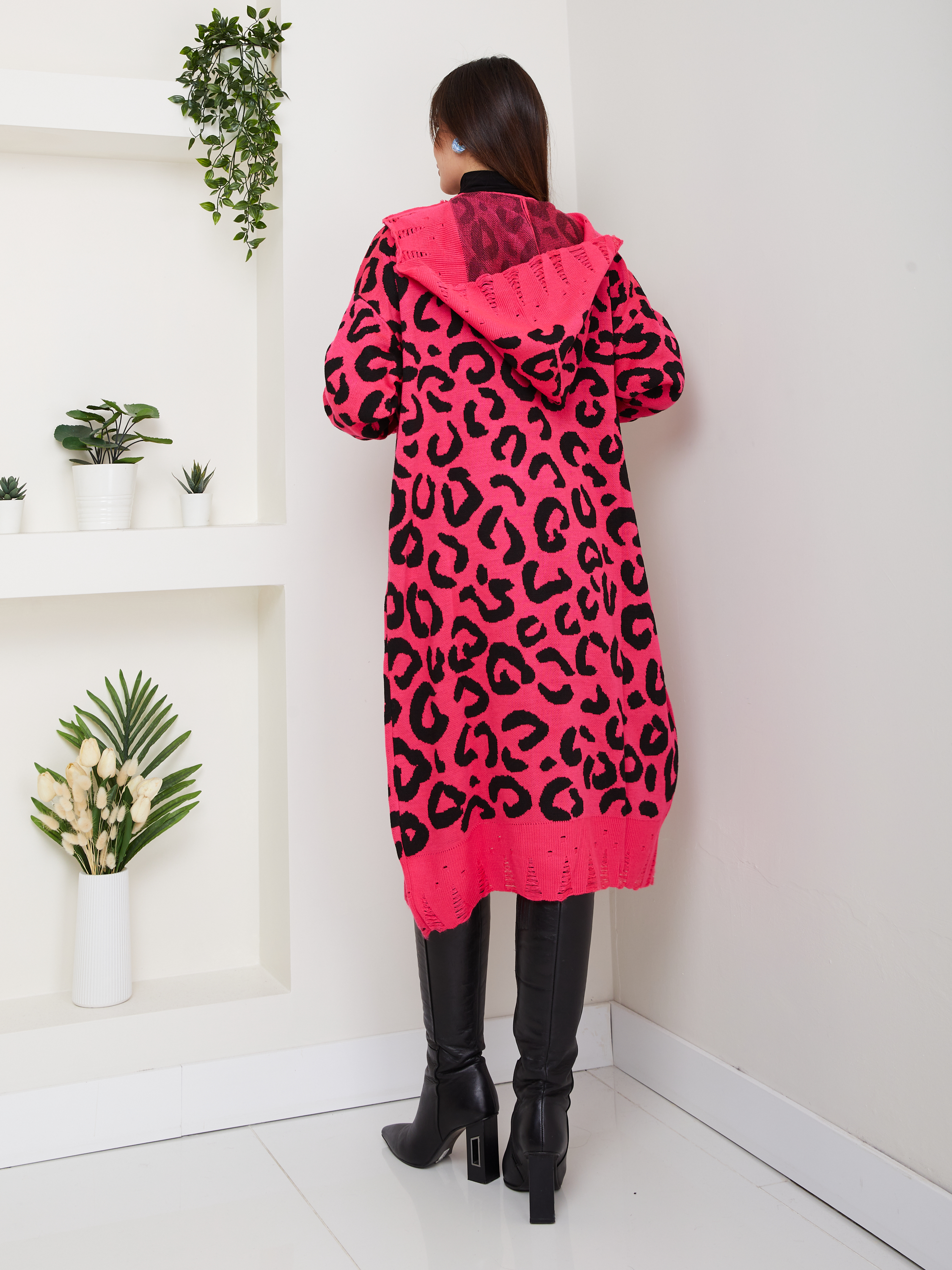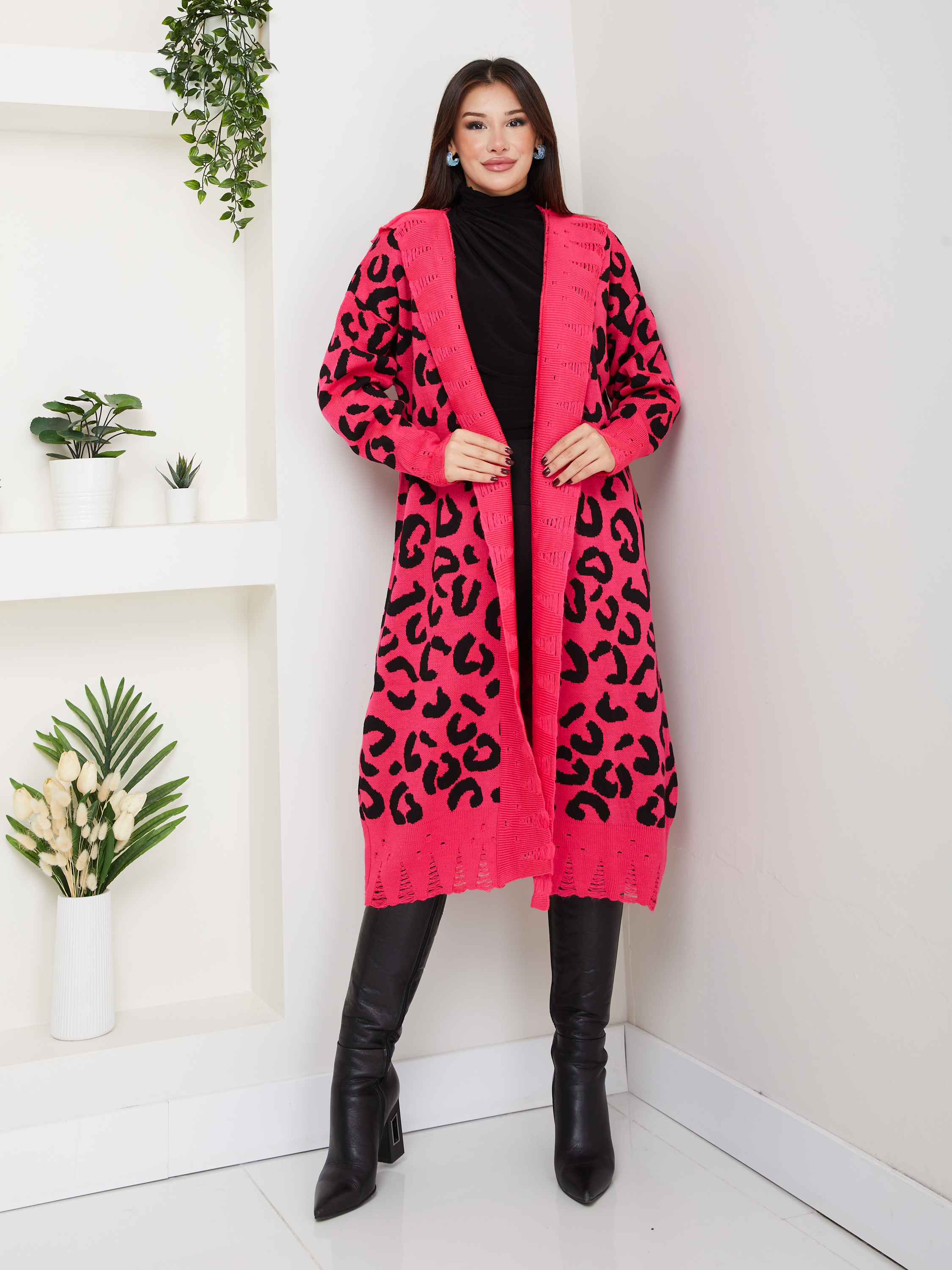 Kapüşonlu Ajurlu Leopar Desenli Uzun Triko Hırka RC8002