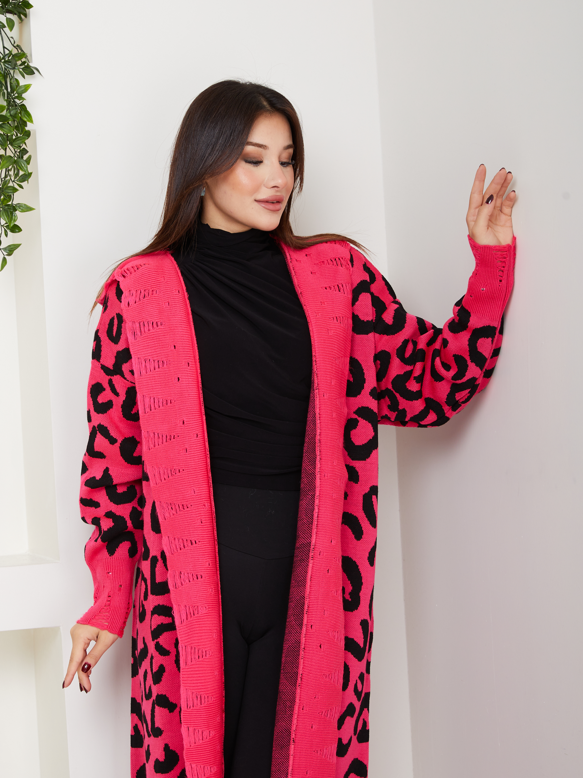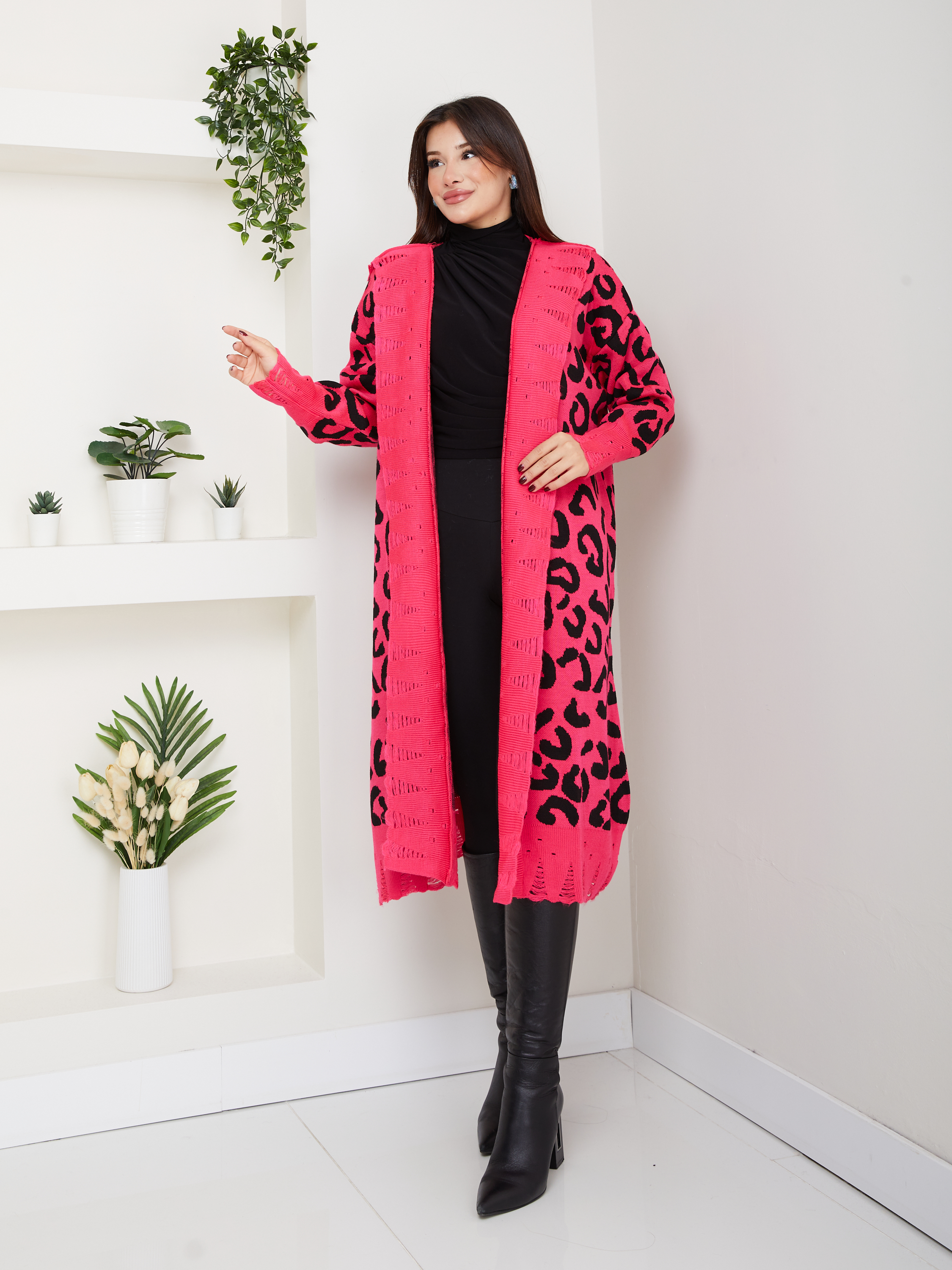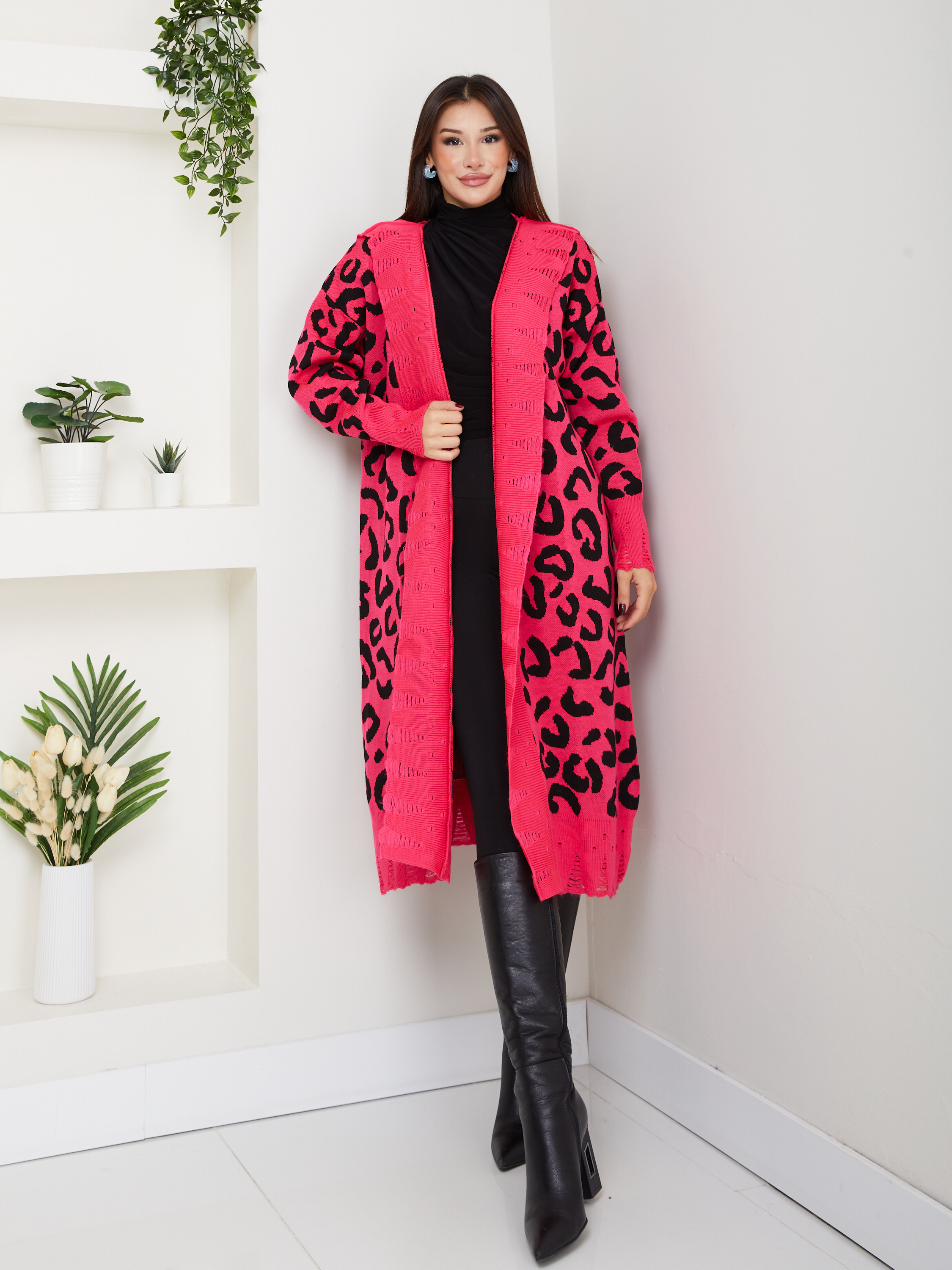 Kapüşonlu Ajurlu Leopar Desenli Uzun Triko Hırka RC8002