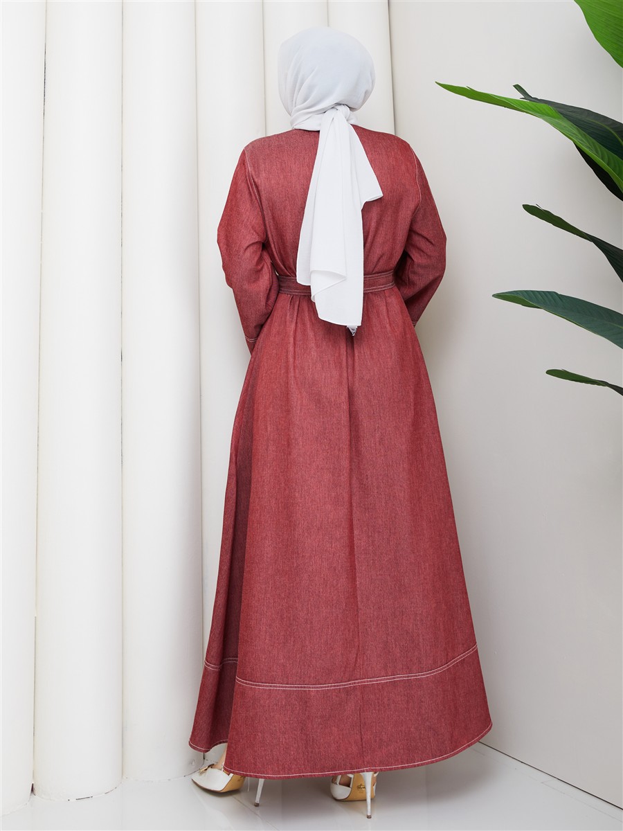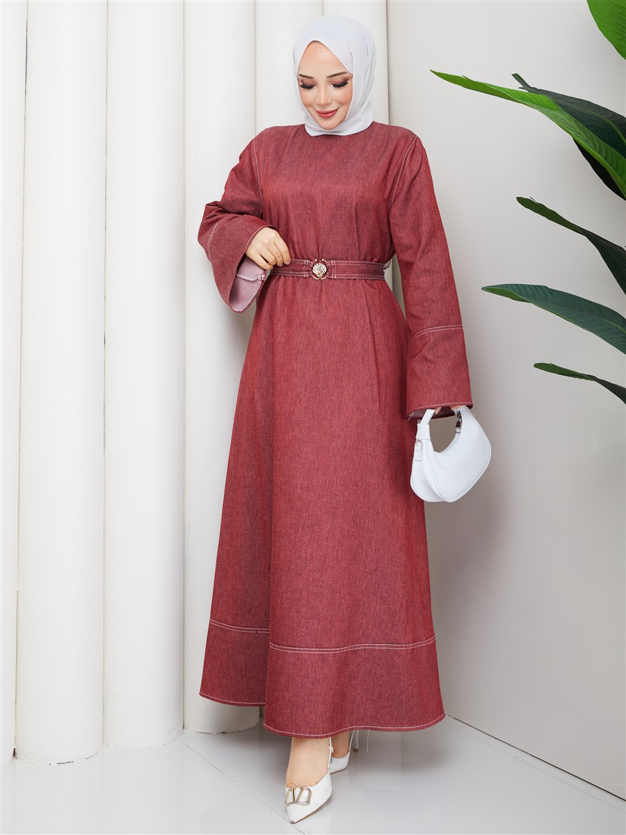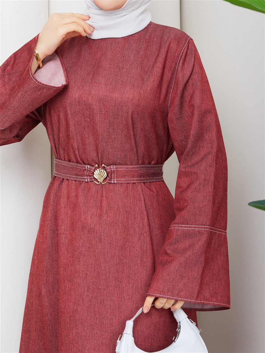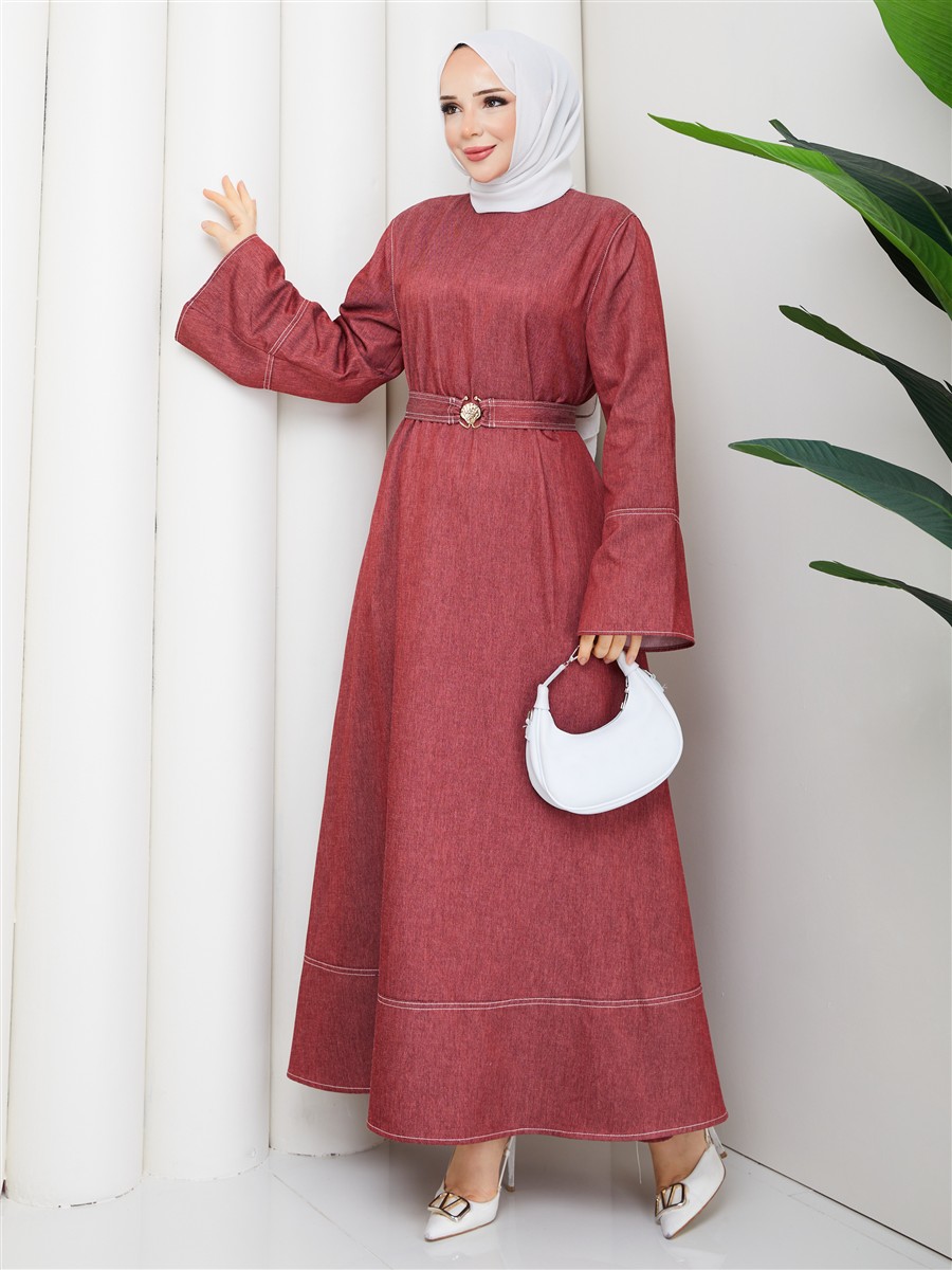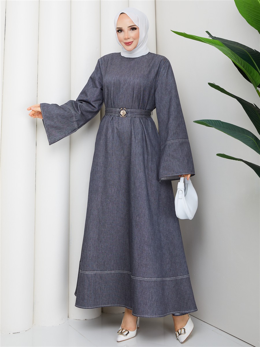 Kemer Detaylı Denim Kot Tesettür Elbise RC6036