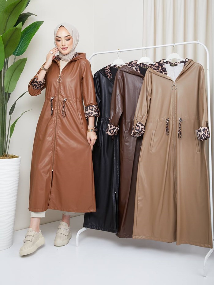 Leopar Desenli Kapüşonlu Deri Kadın Trençkot RC3005
